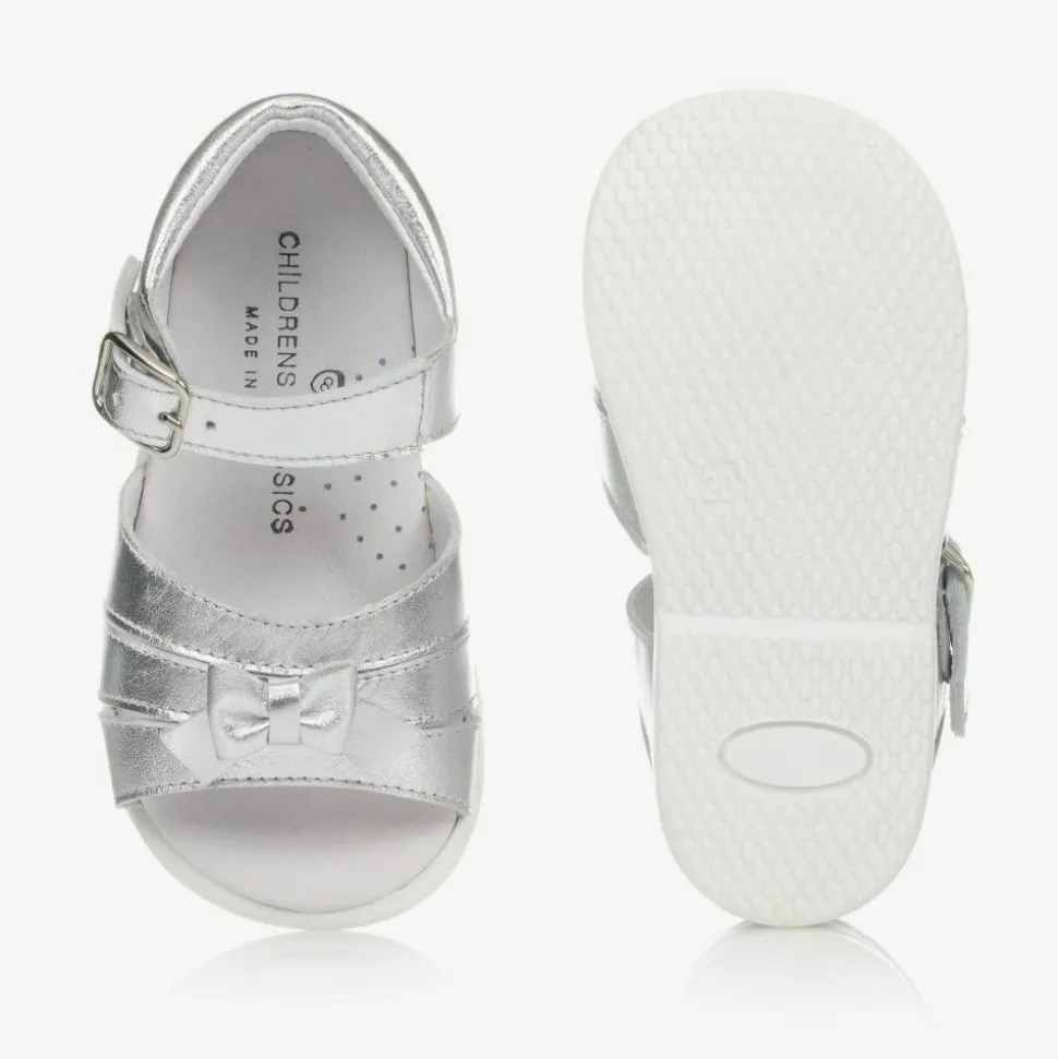 Exclusive to Childrensalon, silver sandals for little girls by Children's Classics. Made from soft leather and lightly padded, the strap across the foot has a pretty silver bow on the front.