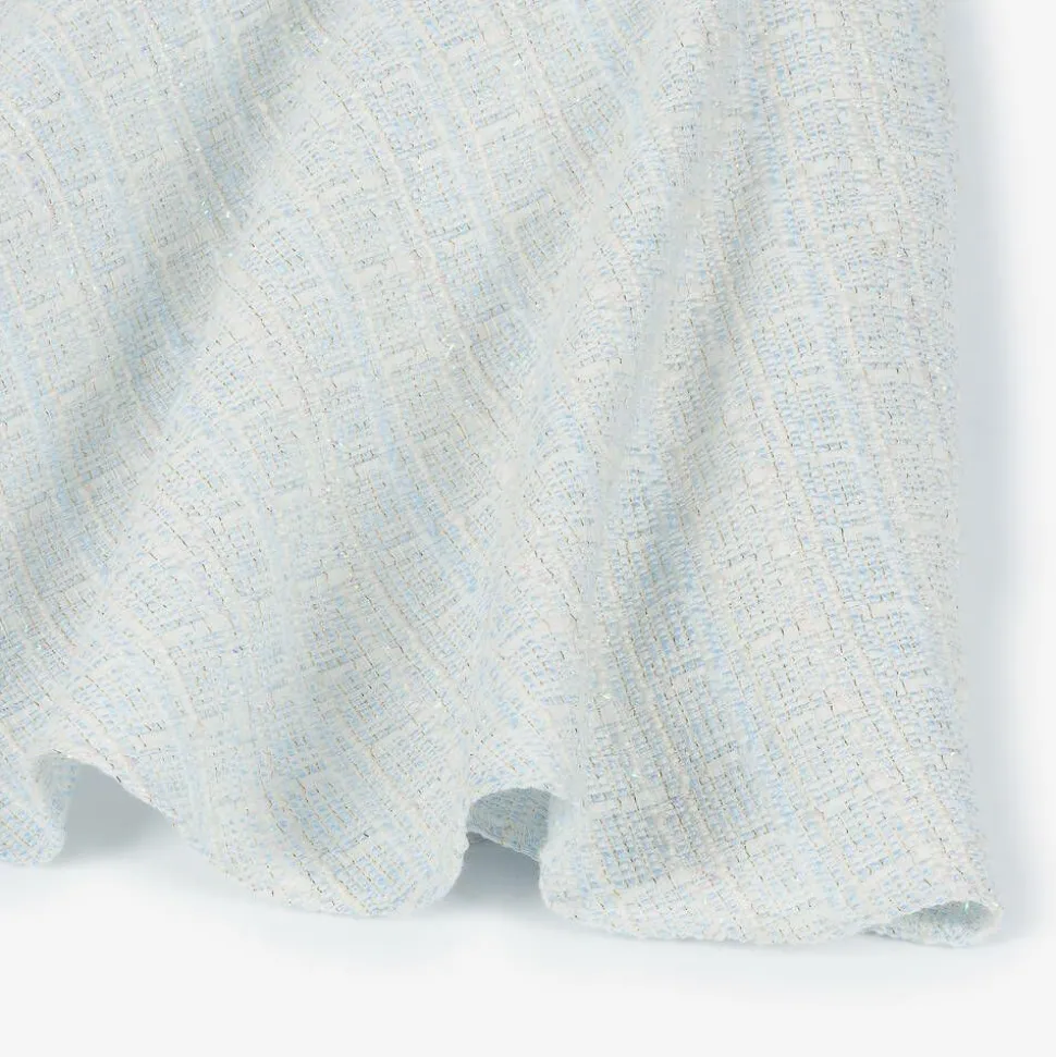 Gorgeous pale blue tweed dress for girls by David Charles, woven with glittery gold thread for a lovely sparkle. Ideal for a special occasion, this elegant fit and flare style is trimmed with ruffles and beautiful diamanté bows and pearls. Fastening with a concealed zip on the back, the dress has a silky satin lining with a structured tulle trim for shape and volume.