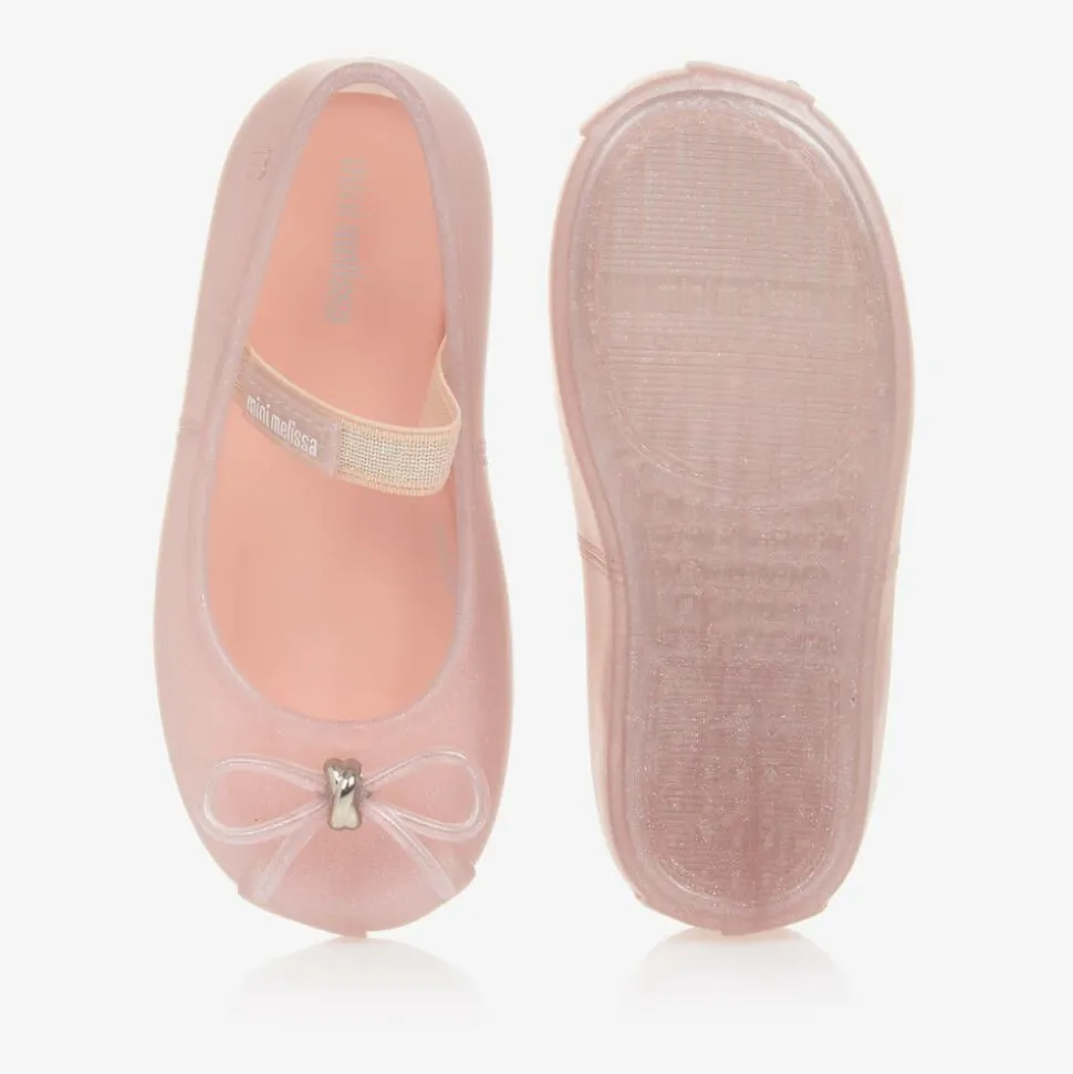 Pink jelly shoes for little girls by Mini Melissa, made in the designer's signature Melflex material. These glittery shoes are designed like a ballerina pump, with a sparkly, elasticated strap across each foot for improved support. The padded foam insole ensures a comfortable fit, and the ridged outer sole helps with grip. A bow and metallic silver accent completes the look with a pretty finishing touch.