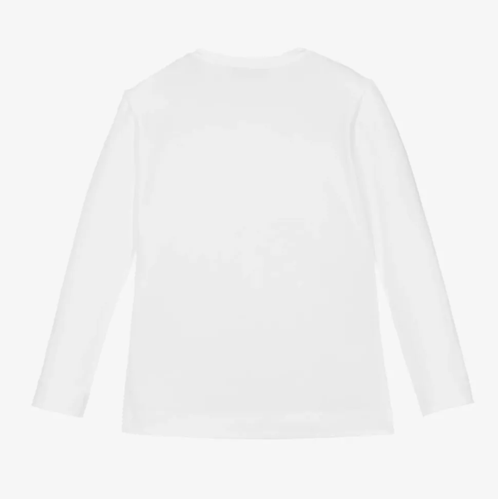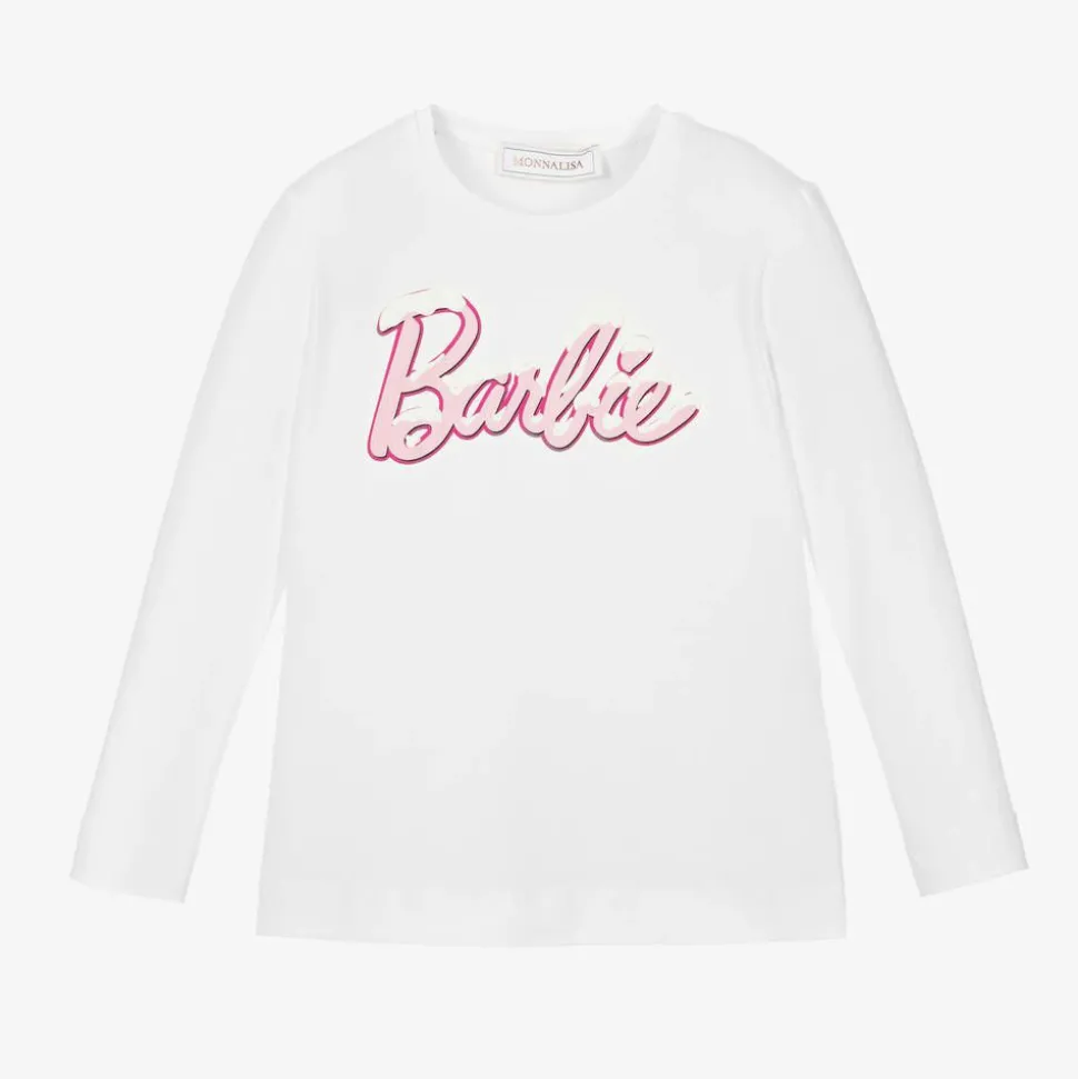 From Monnalisa, a white cotton top for girls with a large pink logo on the front. This long-sleeved jersey top is part of the official Barbie⢠collection.