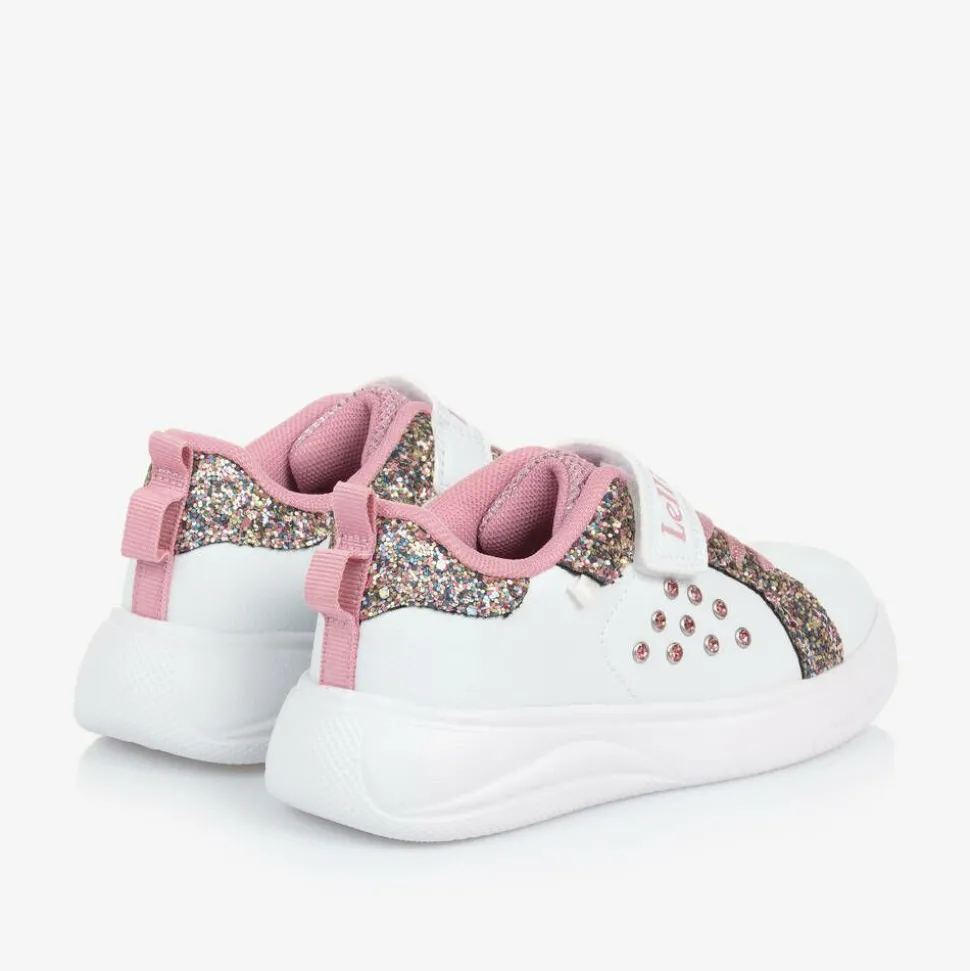 Gorgeous white faux leather trainers for girls by Lelli Kelly, with glittery pink, blue and gold trims. They are decorated on one side with sparkly pink diamantés and come with detachable charm bracelets on the back of the heels. Designed with elasticated laces and a logo-branded velcro strap, they have a soft textile lining and removable, cushioned insole. The flexible white outer sole is textured on the bottom for improved grip.