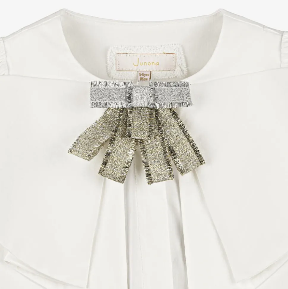 Off-white blouse for girls by Junona, made in soft and lightweight cotton. Lovely for smart occasion wear, this button-up blouse has oversized ruffles on the bodice and a detachable glitter bow on the neckline in gold and silver shades. The same metallic fringing can be seen around the buttoned cuffs for extra detailing. The fabric is gathered on the shoulder, adding fullness to the long sleeves.