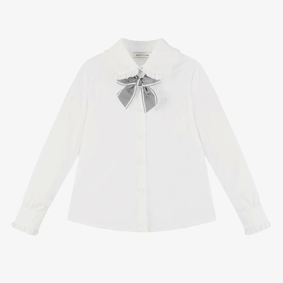 Smart white long-sleeved buttoned blouse for girls by Italian brand Monnalisa, made in soft cotton poplin. Adding a pretty touch, the collar and cuffs have ruffled trim and there is a detachable, grey grosgrain bow at the neck. The side seams are split at the hem for ease of movement and a chest pocket with tonal logo embroidery finishes the look with a discreet designer touch.