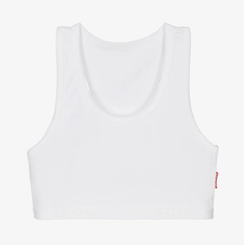 Girls white bra top by Dutch brand Claesen's, made in soft and stretchy cotton jersey. It has a sporty racerback and an elasticated logo band for extra comfort.