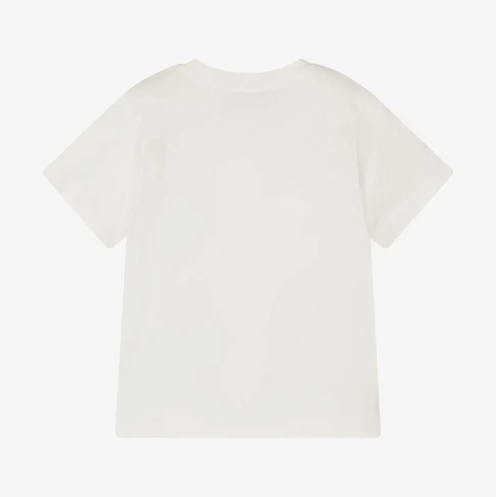 Off-white T-shirt for girls by Stella McCartney Kids, made in soft organic cotton jersey. This casual, short-sleeved tee has a circular blue logo on the front and fun, smiling fairies in colourful pastel shades.