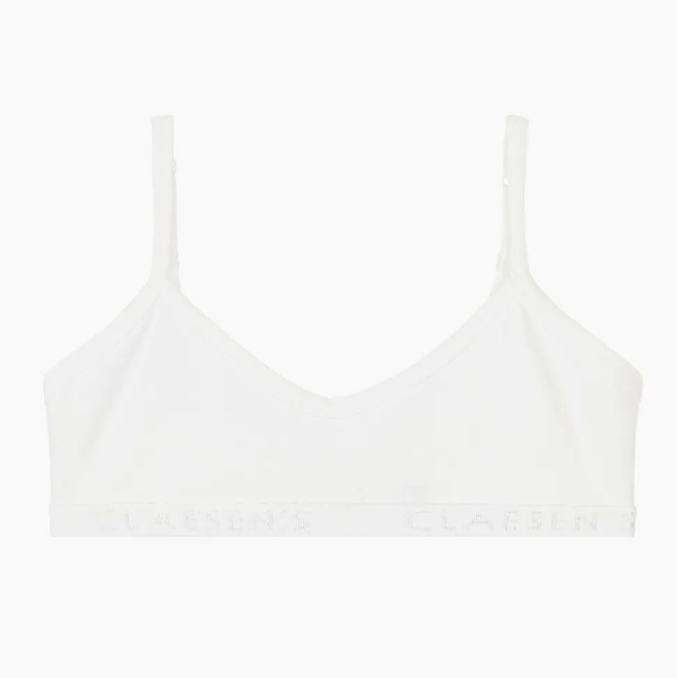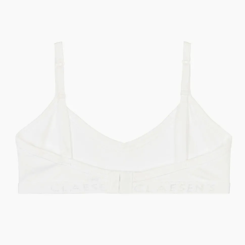 Girls white bra by Dutch brand Claesen's, made in soft and stretchy cotton jersey. It has adjustable shoulder straps and an elasticated band underneath for extra comfort. The straps fasten on the back with hook and eye closures for a secure fit.