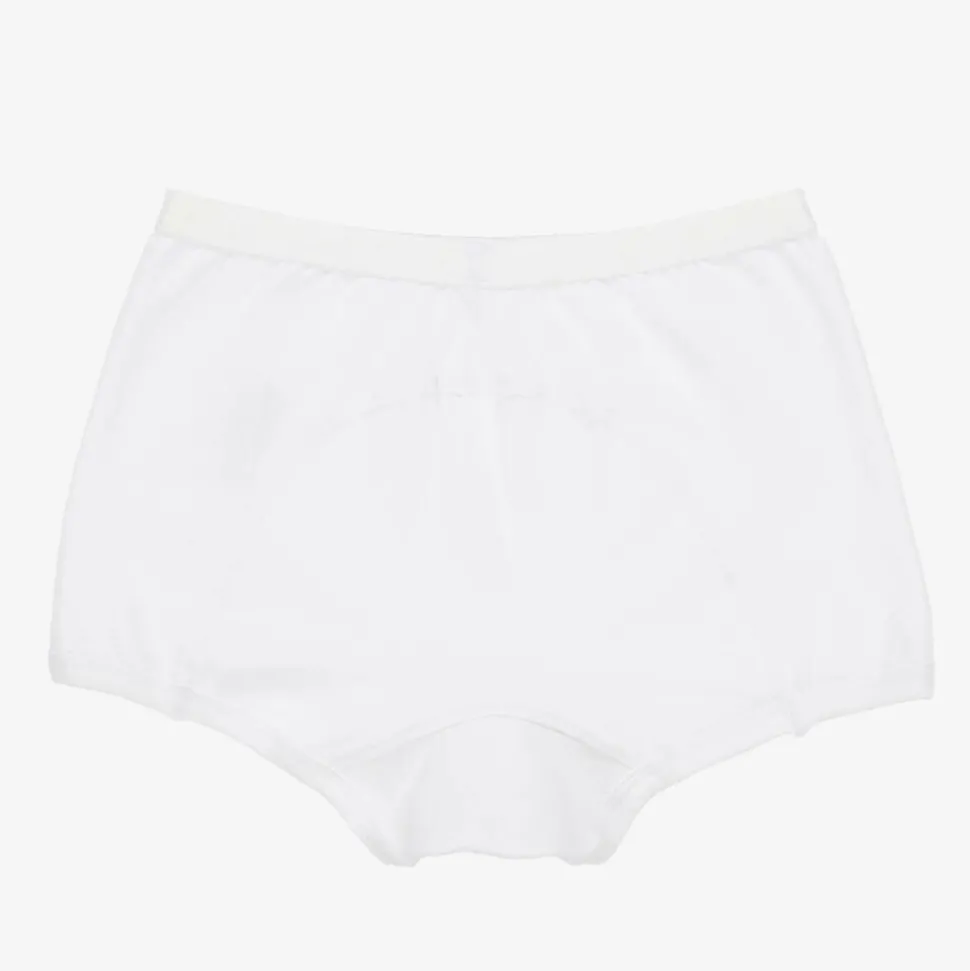 Pack of two white boxer-style knickers for girls by Claesen's, made in soft and stretchy cotton jersey. Comfortable and easy to wear, they have a tonal logo branded waistband.