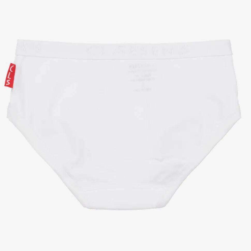 Pack of two white knickers for girls by Claesen's, made in soft and stretchy cotton jersey. These comfortable briefs have a tonal logo branded elasticated waistband.