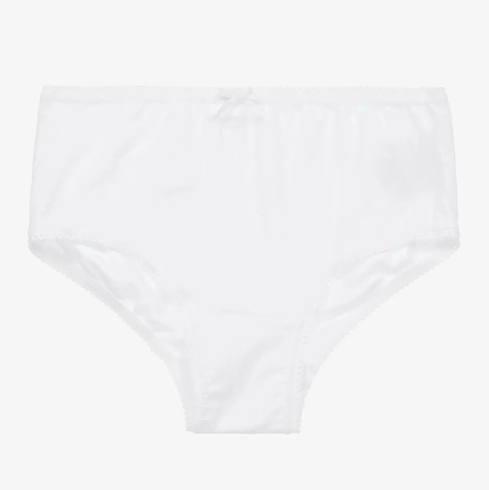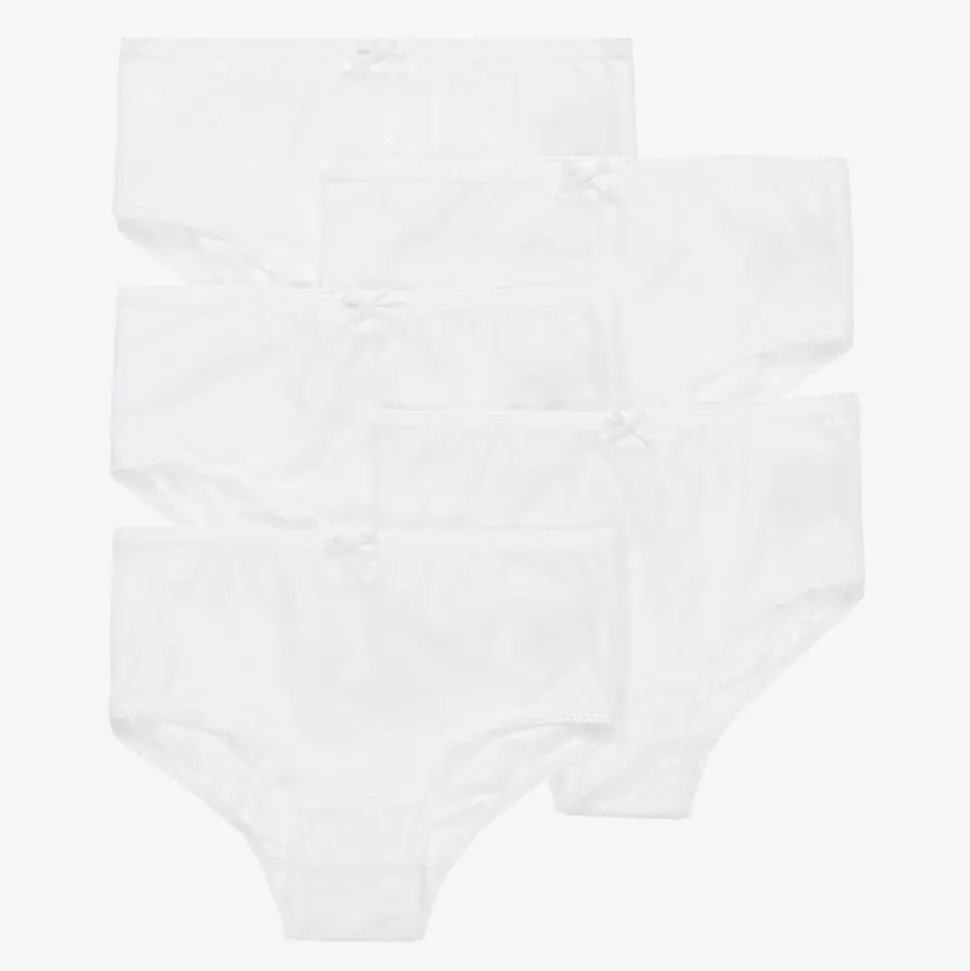 White organic cotton knickers for girls by British brand Childrensalon Essentials, in a useful pack of five. Made in beautifully soft, comfortable jersey, they have a sweet grosgrain bow on the waist and pretty white ric rac trims.