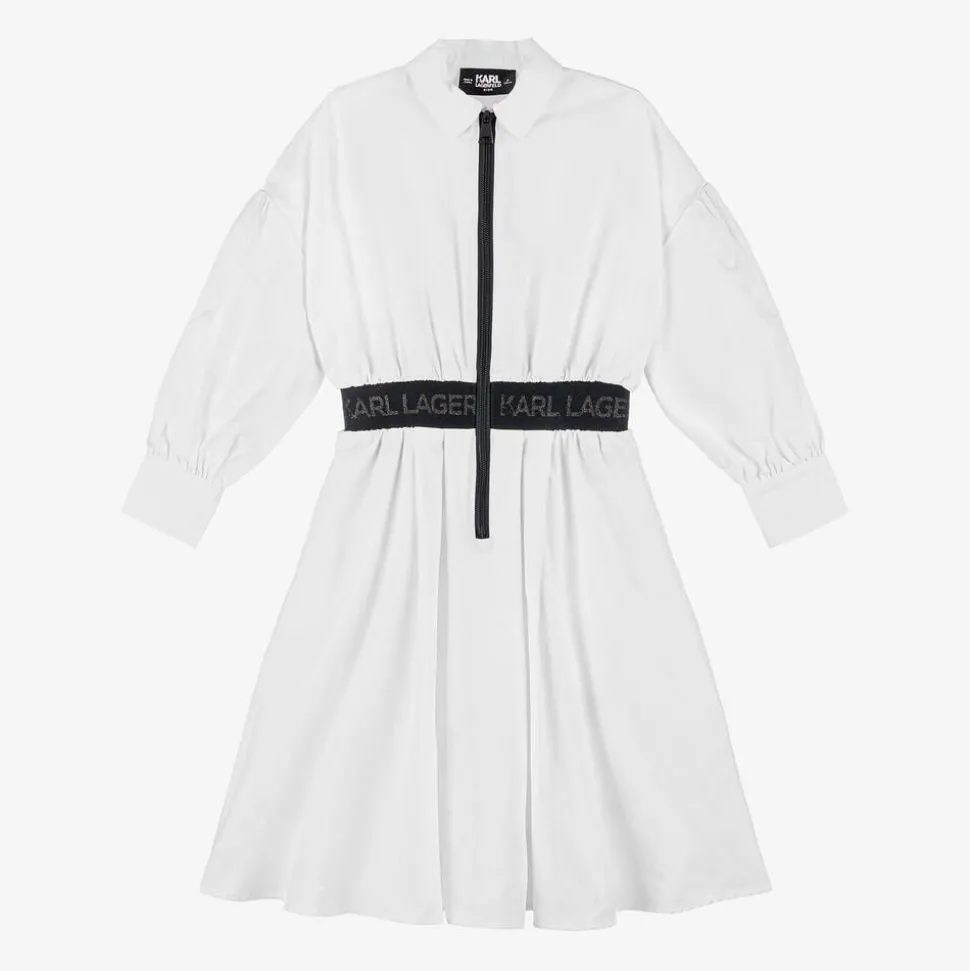 Designed by KARL LAGERFELD KIDS, this white dress for girls is made from comfortable, cotton-blend twill. In a cool shirt style, it has a pointed collar and dropped-shoulder puffed sleeves with buttoned cuffs. Fastening with an exposed black zip on the front, it has an elasticated waistband with sparkly jacquard logos for an added branded touch. The flared skirt has pleated detailing on both sides and discreet pockets hidden in the side seams.