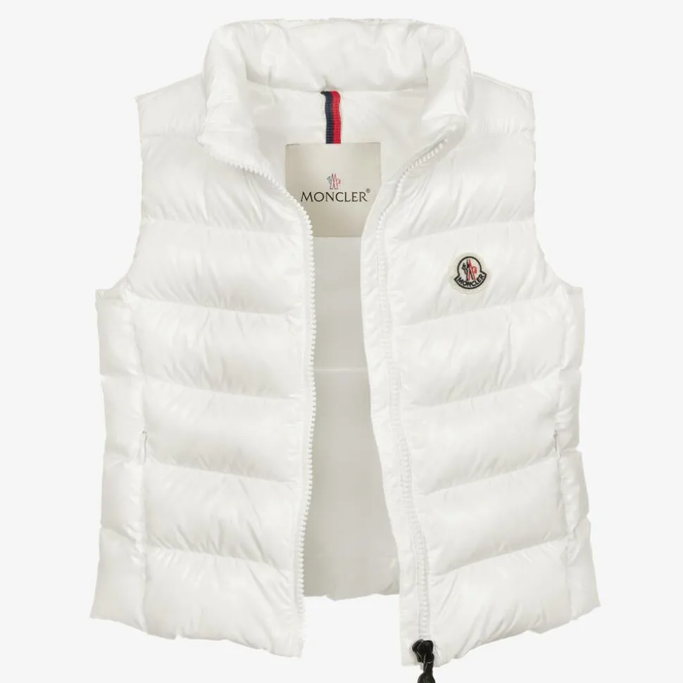 White puffer gilet for girls by luxury French designer Moncler Enfant, padded with lightweight, warm down. Stylish and water repellent jacket, it has the brand's iconic felt logo on the chest and fastens with a logo zip on the front for a luxurious added detail.