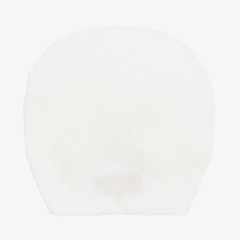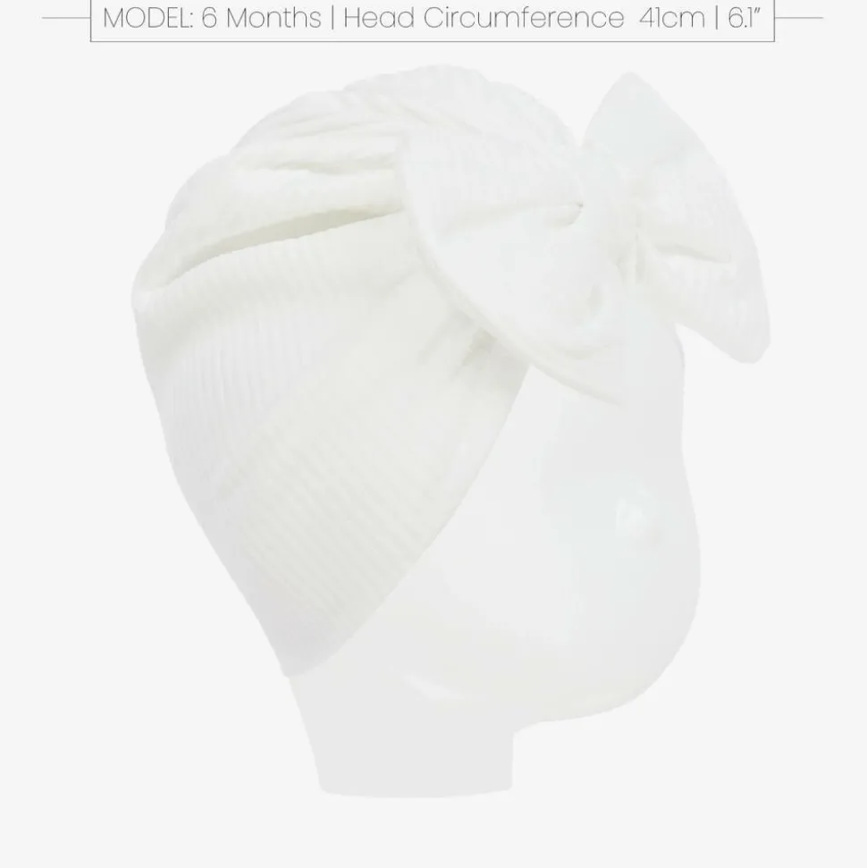 A lovely white turban style hat for younger girls by Caramelo Kids. Comfortable to wear, it is made in soft and stretchy ribbed jersey, and has a large bow on the front.