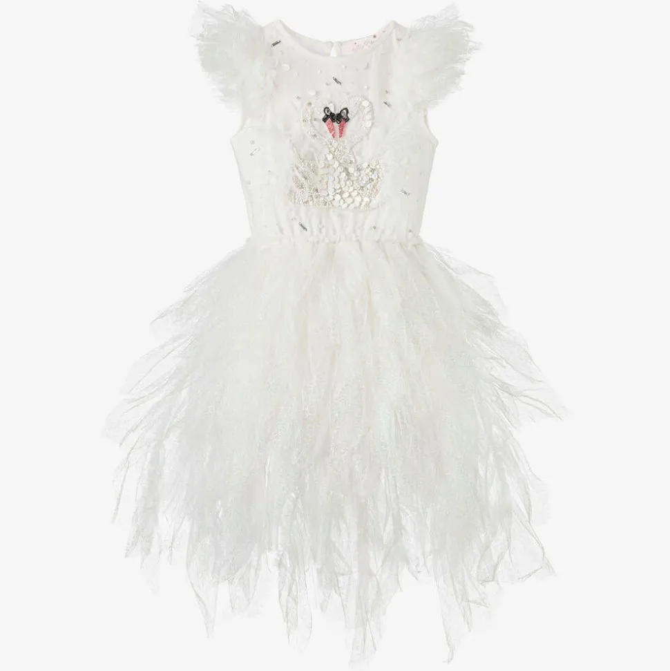 Stunning white swan lake costume dress for girls by Tutu du Monde, made in lightweight tulle with a soft cotton lining for comfort. Two embracing swans created from beads, sequins and feathers adorn the bodice for a sweet, eye-catching look, whilst the layered tulle skirt has iridescent thread throughout which catches the light beautifully. A single button fastening secures the key hole detail on the back for a pretty finish. Items are made to last and become more lovely with wear as slight fading and fraying edges adds to their charm.