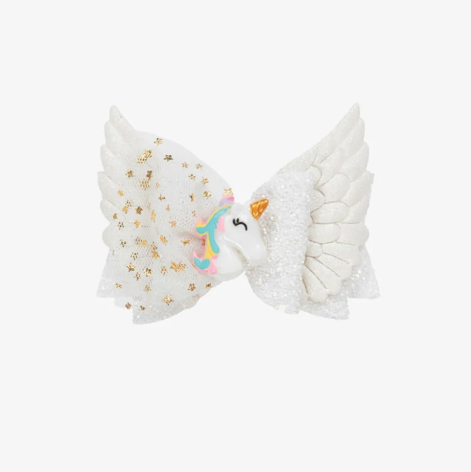 White bow hair clip for girls, by Bowtique London. It has lovely sparkly, textured trims with a sweet unicorn character for a playful touch. There is a metal slide fastening on the back for easy dressing.
