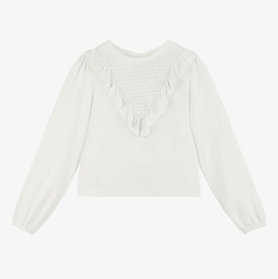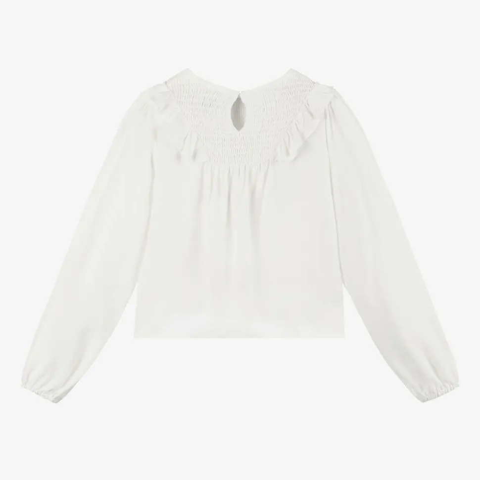 Pretty White blouse for older girls by Mayoral, made in soft viscose twill. There is a frill on the front and over the shoulders, with shirred panels front and back. The long sleeves have elasticated cuffs and there is a single keyhole button fastening on the back.