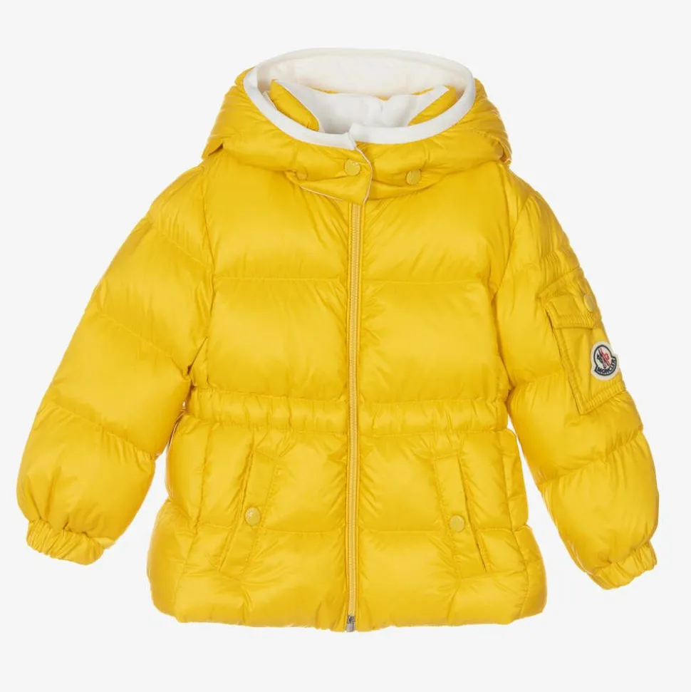 Beautiful golden yellow hooded coat for little girls by Moncler Enfant, made in silky smooth water repellent nylon. Lined in soft cotton jersey, it is padded with luxurious down, which helps keeps your little one warm without the added weight of synthetic padding. There are popper pockets on the front and one sleeve, where the iconic logo badge can also be found. Fastening with a logo zip, it also has a detachable hood for versatility.
