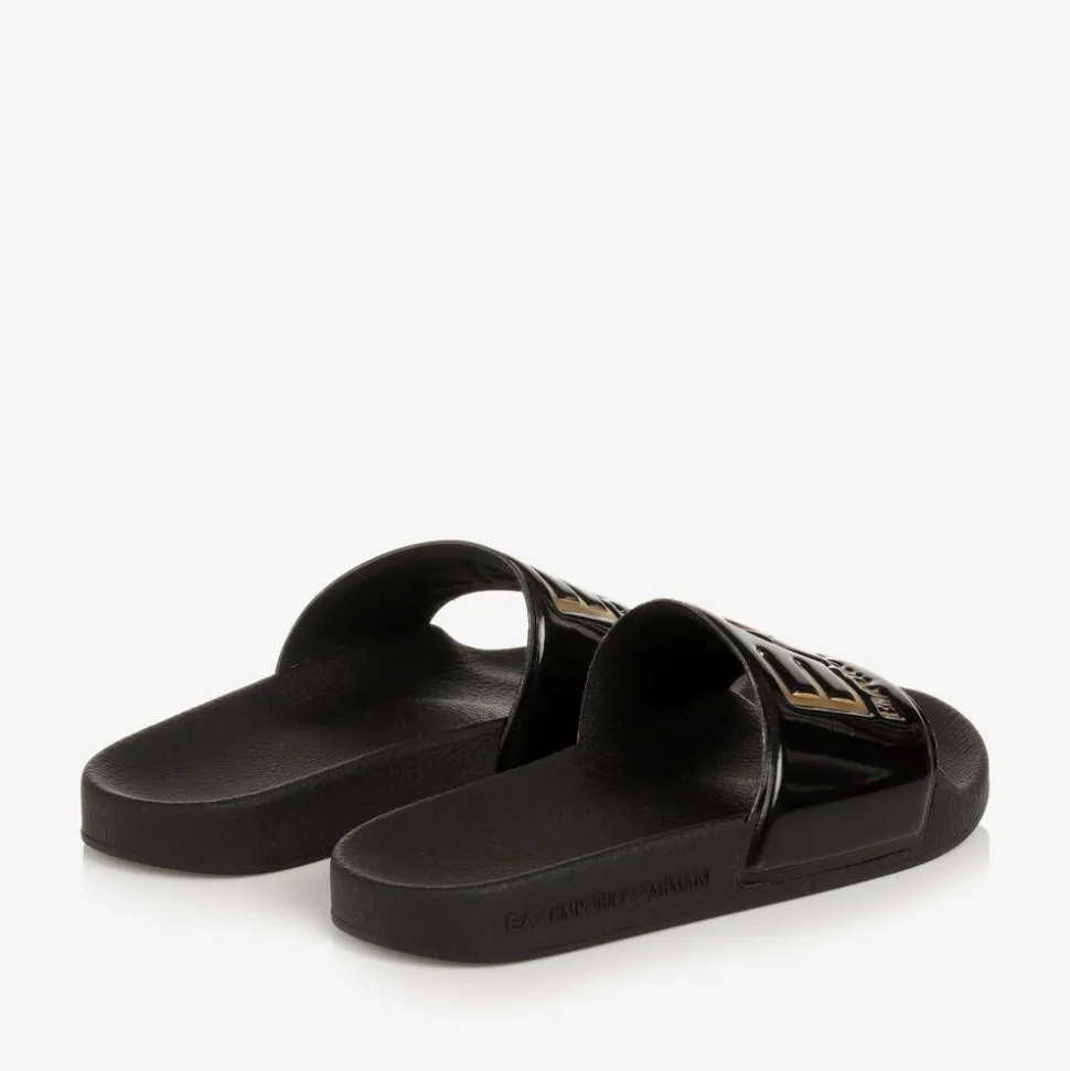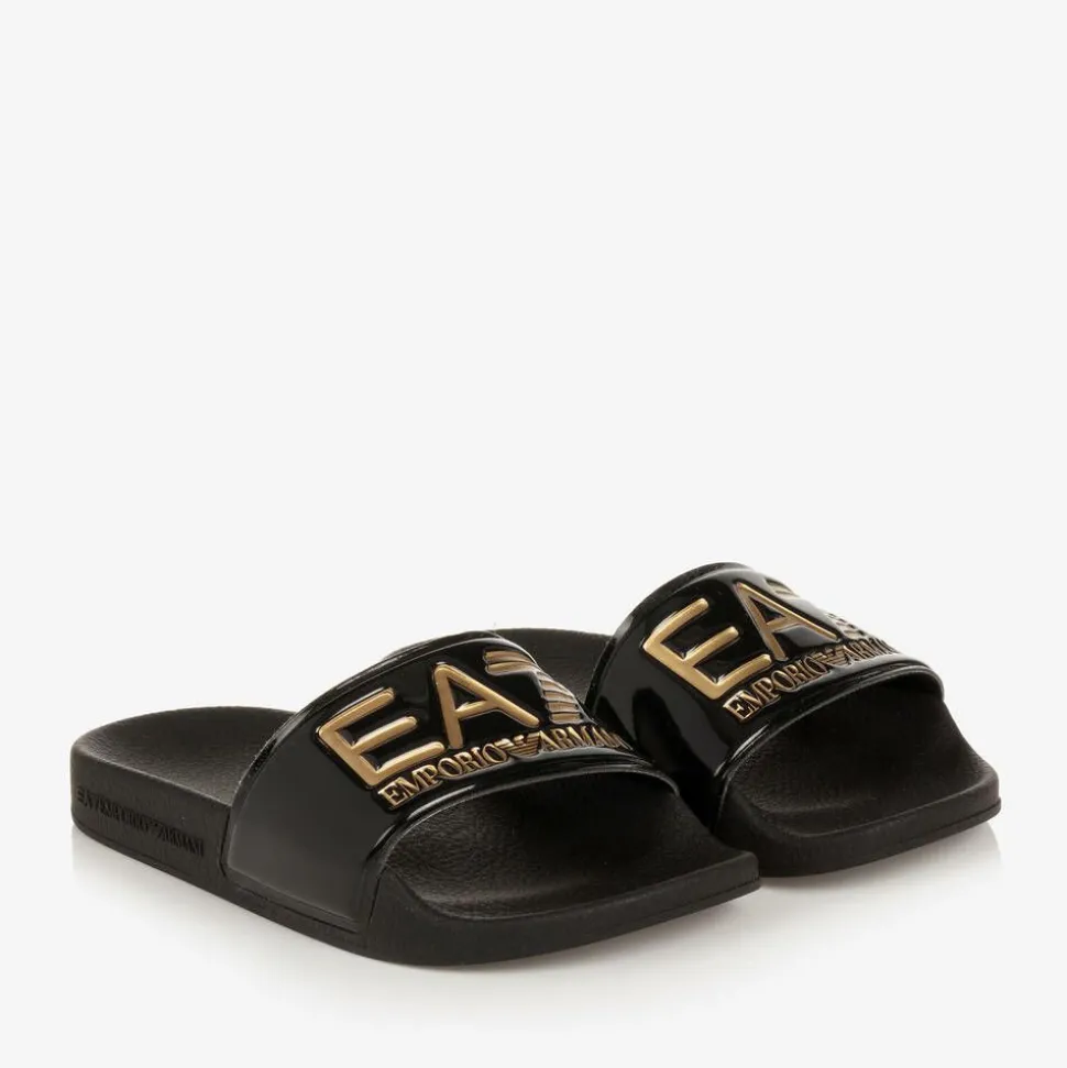 Black sliders for boys and girls from EA7 Emporio Armani, cool for the pool, on the beach or to compliment everyday casual outfits. These easy slip-ons are made from soft rubber with a moulded footbed for comfort. They have a bold gold logo embossed across the glossy finish strap for instant recognition and an additional branding moulded on the sole.