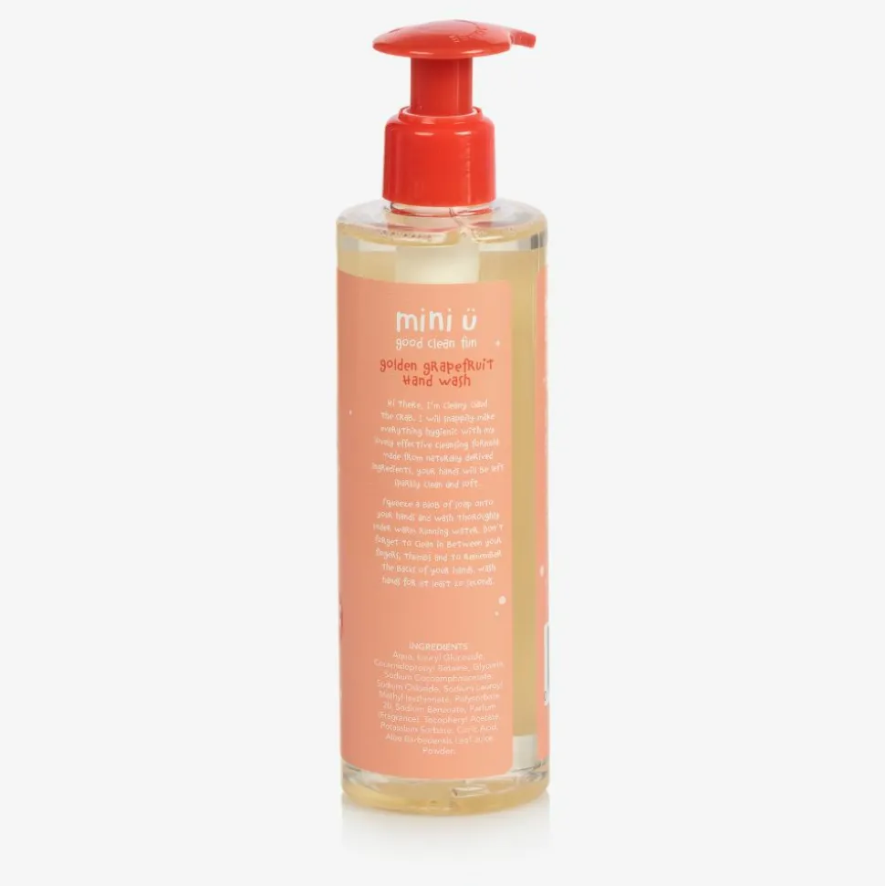 Golden Grapefruit hand wash for little boys and girls by Mini U, made with naturally derived ingredients. Cleansing yet gentle, this formula leaves little hands hygienic with a fresh grapefruit scent. To use, pump onto hands and wash under warm water.