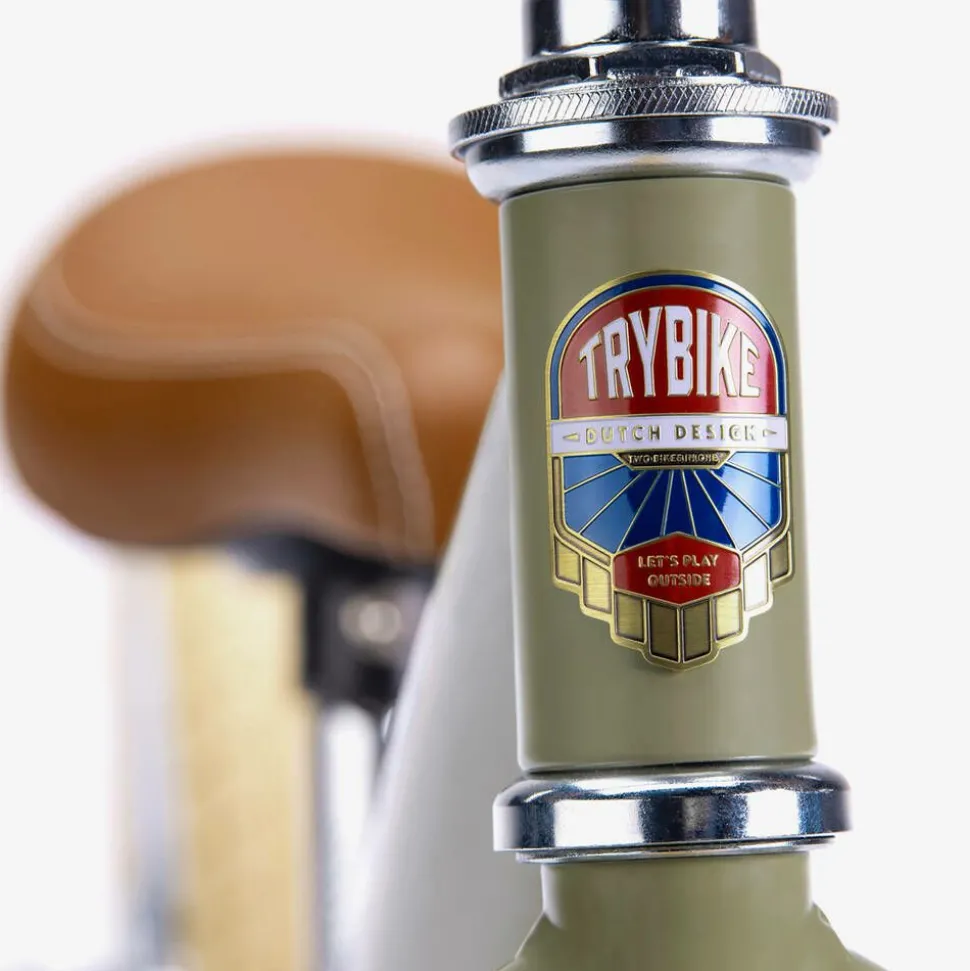 Matte green 2-in-1 trike for little boys and girls by Trybike, easily convertible through different stages of their development. It has an adjustable handlebar and saddle for comfort and inflatable 12" wheels for a smooth ride. The handlebars are designed with a unique, small-turning radius to help budding cyclists with easy manoeuvring. As your little one grows, the trike can transform into a balance bike, ideal for children to test out their balance and mobility skills. The frame is customisable with a variety of fun, retro-inspired stickers.