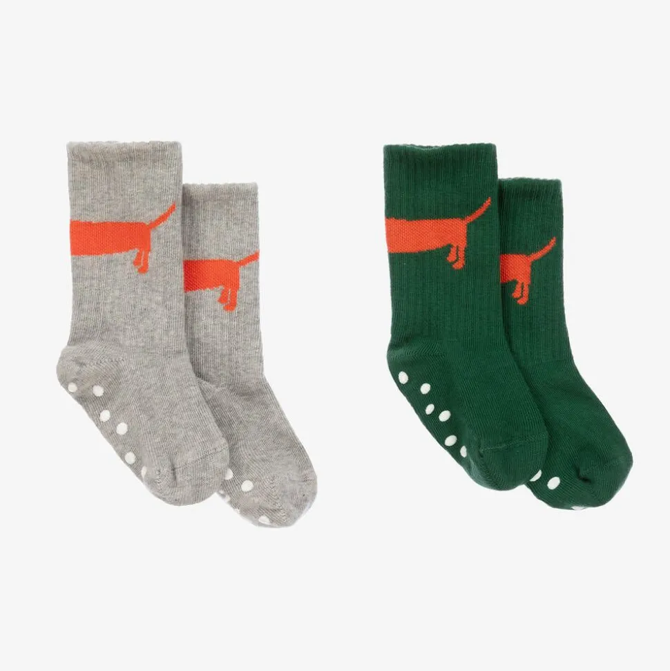In a handy pack of two, these green and grey socks for boys and girls by Mini Rodini, feature a fun dog motif in orange. Stretchy and comfortable, they are made in an organic cotton blend, with the designer's name and anti-slip pads underfoot for improved grip.