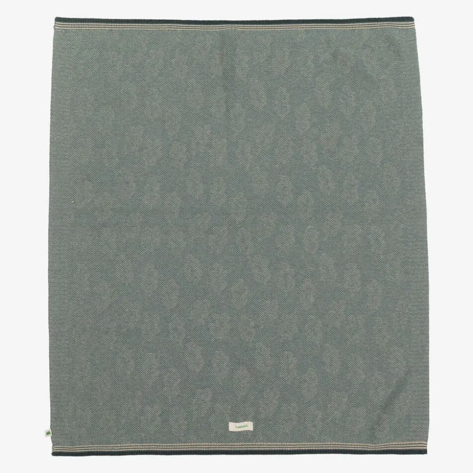 In a lovely shade of dark green, this knitted blanket for baby boys and girls by the bonniemob, is made in a beautifully soft blend of organic cotton and cashmere. It has a charming acorn leaf pattern and coordinating striped trims and is ideal for keeping baby warm and cosy when out and about in the pram or stroller.