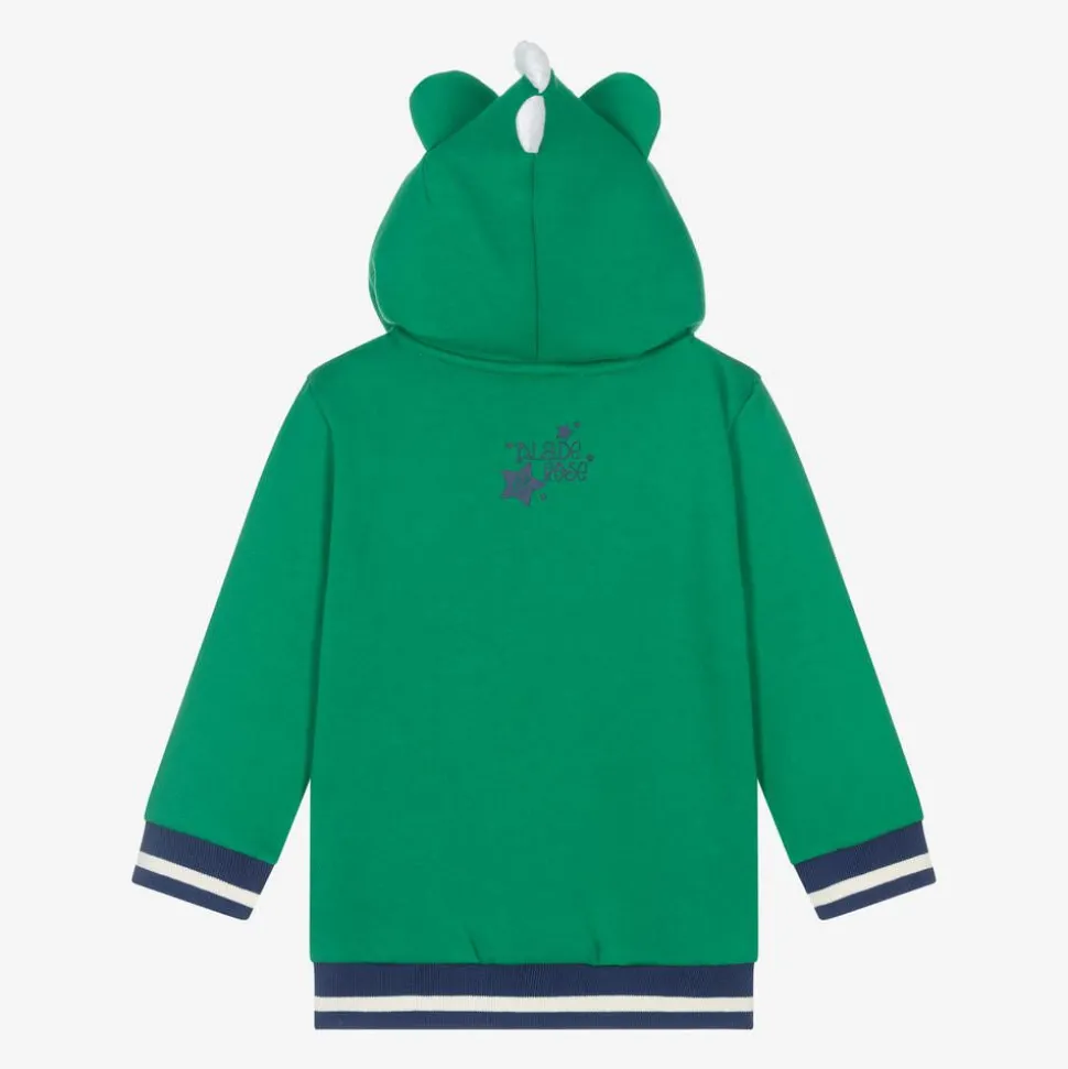 From Blade and Rose, cute green zip-up top for little boys and girls made in cotton jersey. For fuss-free dressing it fastens with a zip on the front and has ribbed trims for added comfort. The hood is lined with super soft fleece and finished with a dinosaur face with 3D spikes ideal for playing make-believe as Maple the dino.