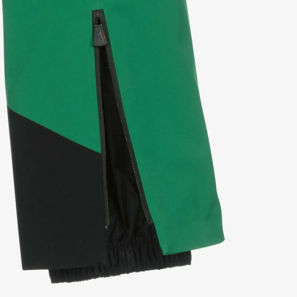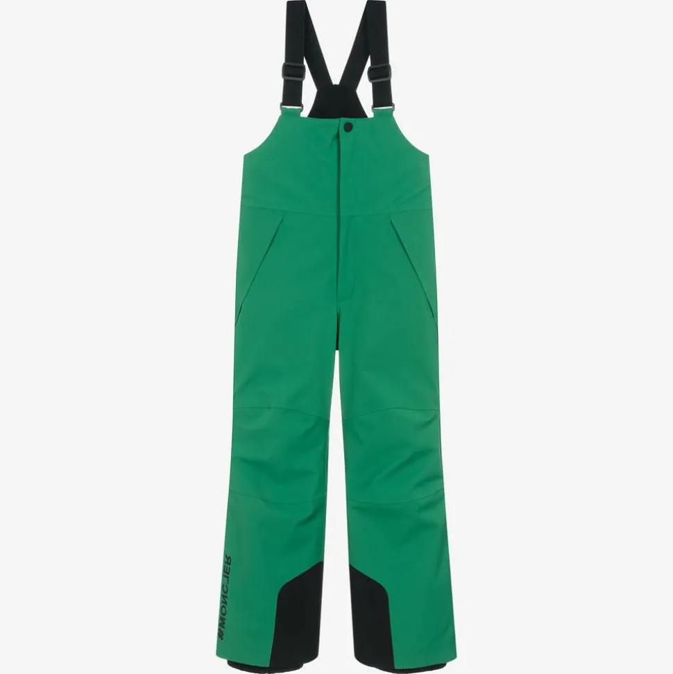Green high-performance ski salopettes for boys and girls by luxury label Moncler Enfant. Designed for intensive sport, they boast water-repellent, breathable and wind-resistant qualities. Padded with warm yet lightweight, recycled Primaloft padding, they provide good thermal insulation even when wet and the zips are waterproof for extra protection from the elements. The legs, fastenings and adjustable shoulder straps are detailed with logos for instant brand awareness. They have internal elasticated gaiters and taped seams to keep out the snow and a polar fleece part-lining for extra warmth. There are reinforced panels on the legs for increased durability and fleece-lined zip-up pockets to warm small hands. A black logo patch on the back completes this designer look.