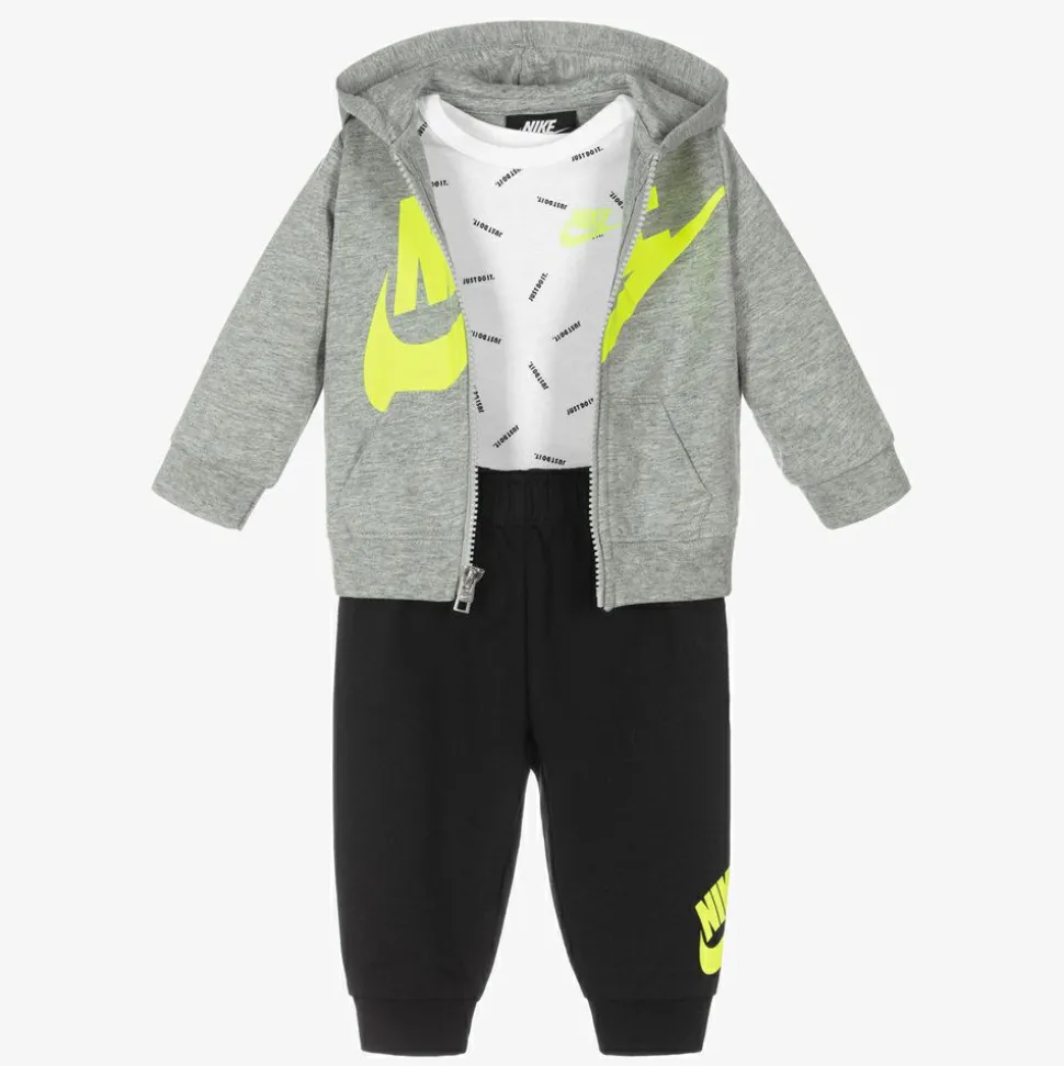 Grey and black tracksuit set for little boys by Nike, made in comfortable cotton sweatshirt jersey. The grey hoodie has a neon green Swoosh logo and a front zip fastening. The black have an elasticated waistband and a green logo print. The white bodyvest has an all-over logo print and popper fastening between the legs.