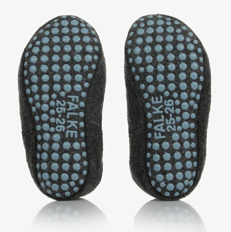 Cosy grey and navy blue slippers for boys and girls by Falke, made from warm Merino wool blend. The exterior is in a grey felted wool with stretchy navy blue ribbed sock trims around the openings. The insole is lightly padded and there are blue printed dots on the outsoles for improved grips.