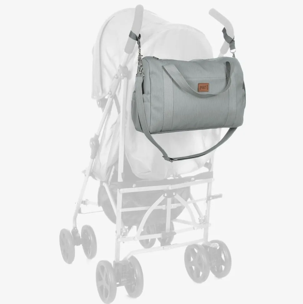 Practical grey changing bag from Paz Rodriguez, made in smooth, water resistant canvas. There is one large zipped compartment, with handy pockets on the front and sides for extra storage space. It comes with useful detachable buggy straps and adjustable shoulder strap, adding versatile carry options.