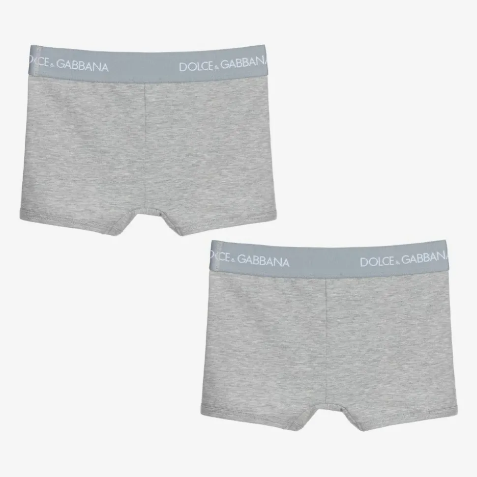 Boys grey boxer shorts by luxury Italian brand Dolce & Gabbana. Made in soft and stretchy cotton jersey, they have a grey and white elasticated logo waistband for a comfortable fit.