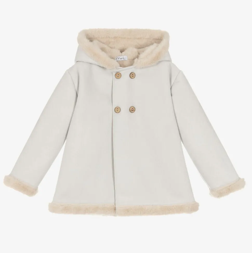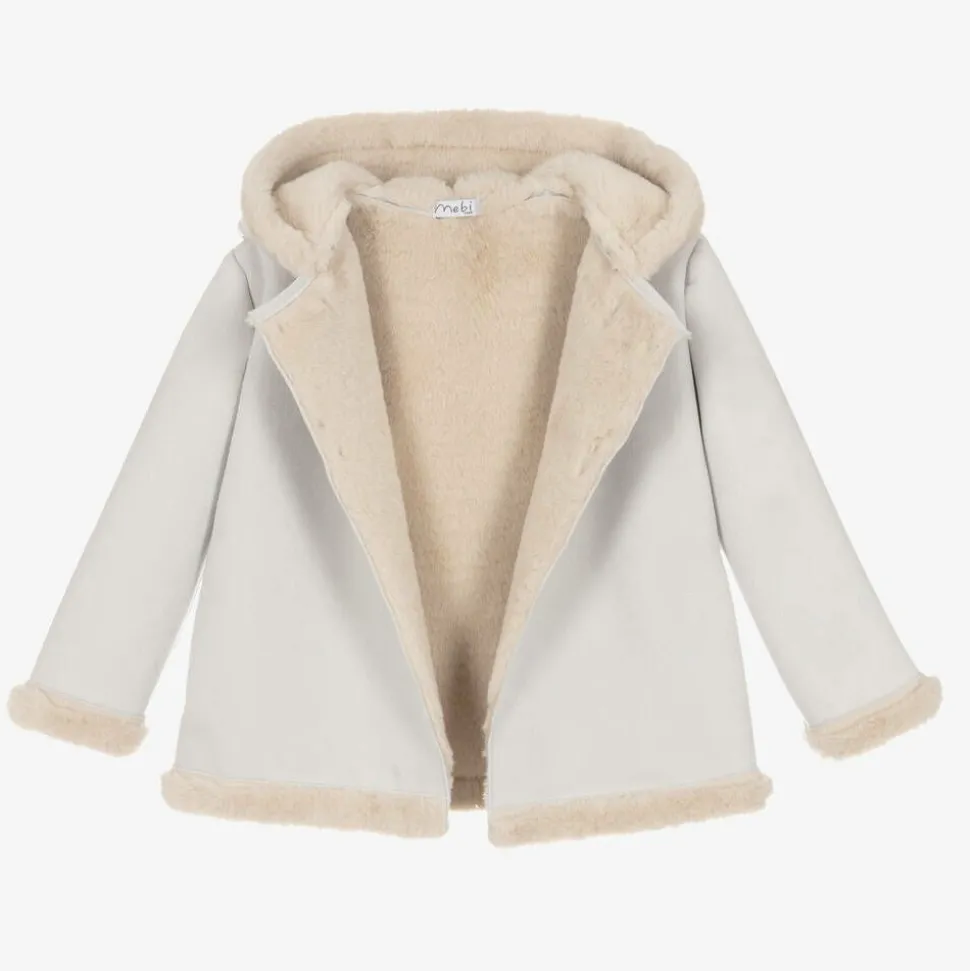 Lovely light grey coat for boys and girls by Spanish brand, Mebi. Made in smooth faux suede, this hooded coat fastens with wooden-style buttons on the front. It is lined in luxuriously soft plush faux fur for a super warm and cosy fit.