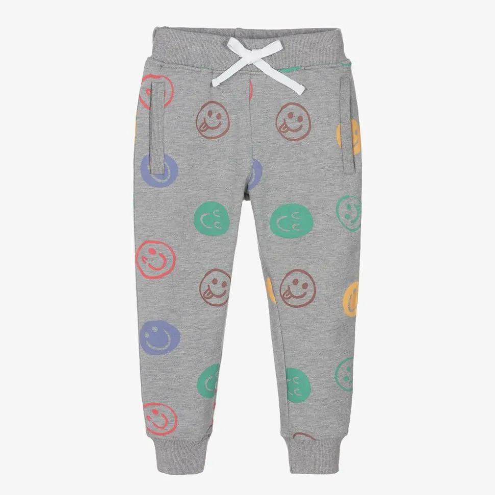 Fun grey marl cotton joggers for boys and girls by Joyday, exclusive to Childrensalon. Made in comfortable jersey for casual days, they have a colourful print of happy faces and neat ribbed trims. The ribbed waistband has a white drawstring for a great fit, and there are useful pockets on the front.