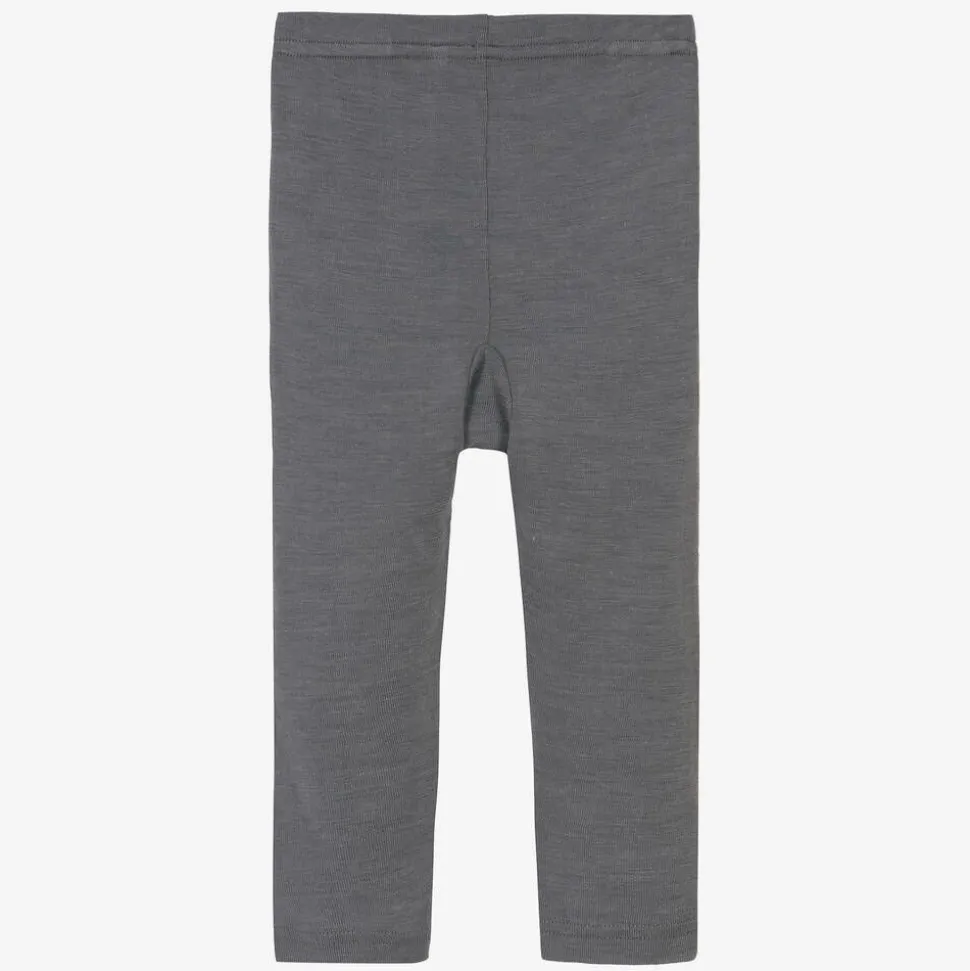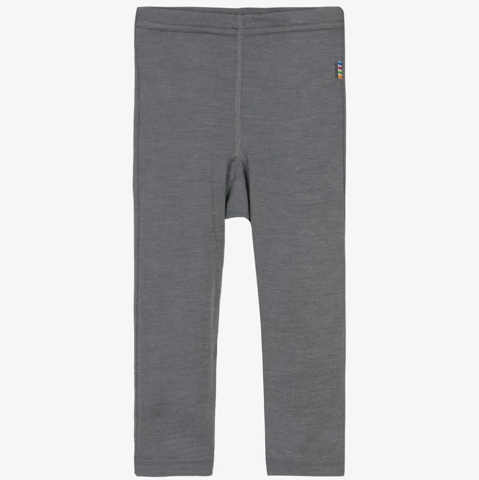 A pair of grey thermal leggings for little boys and girls by Joha, made in a super soft and stretchy Merino wool and silk blend. Ideal as an extra layer when the weather turns colder, they have a comfortable elasticated waistband and a striped rainbow logo tab stitched on one side seam.
