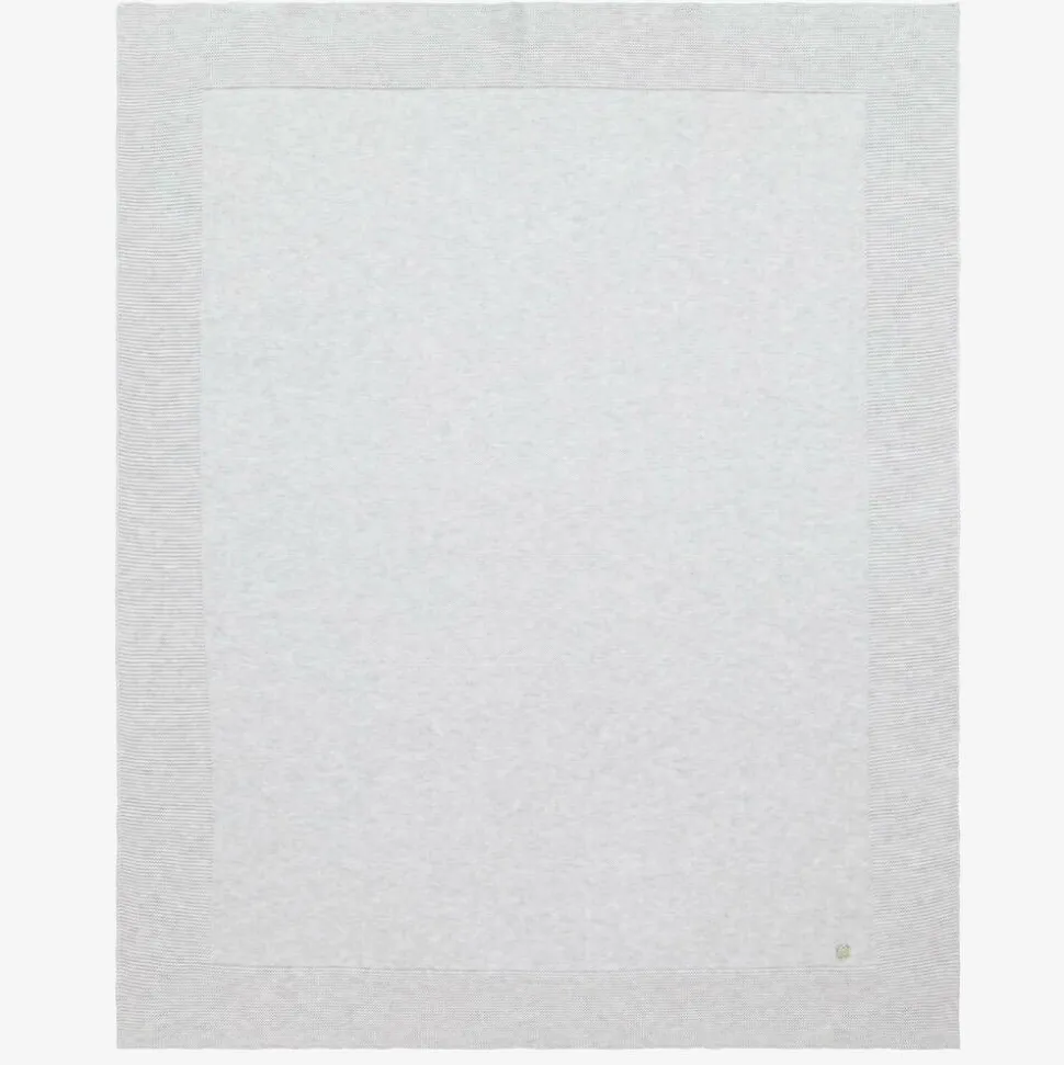 Lovely grey blanket for baby boys and girls by Spanish brand Paz Rodriguez. Knitted in luxuriously soft organic cotton, this simply elegant design has a delicate raised knit border and a sweet mother-of-pearl logo charm.