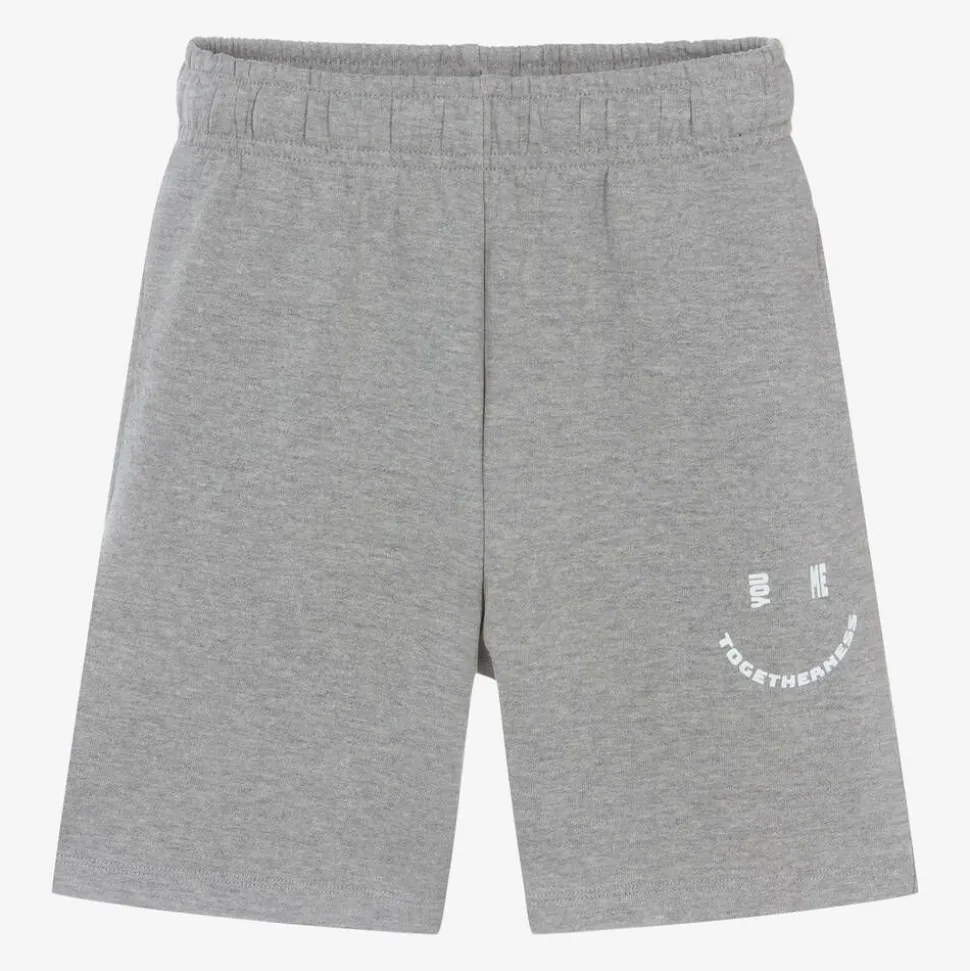Grey jersey shorts for boys and girls from Molo, in soft, stretchy, mid-weight organic cotton. The positive words, 'You', 'Me' and 'Togetherness' are printed on one leg in the shape of a smiling face. They have an elasticated waist with inner drawstrings for the best fit and three useful pockets to complete the style.