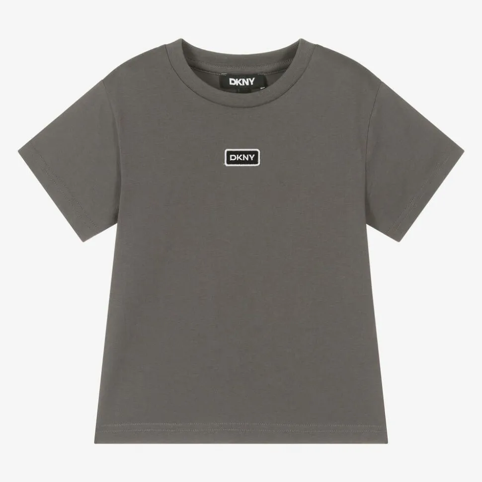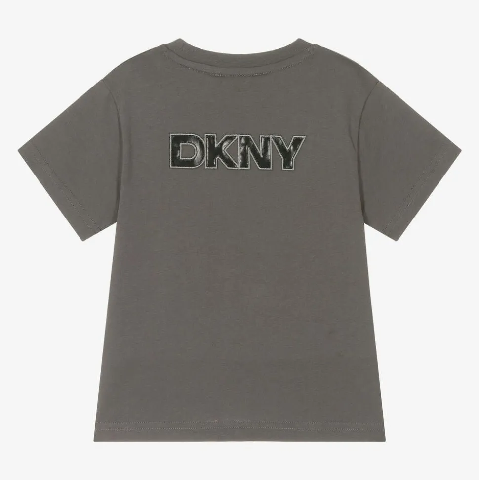 Grey T-shirt for boys and girls by DKNY, made in soft and stretchy organic cotton jersey. For a striking designer statement, it has a large black logo on the back edged with grey embroidery. There is a smaller black and white appliqué logo patch on the front.