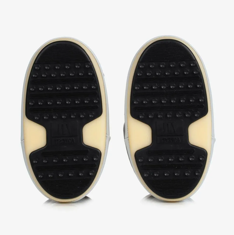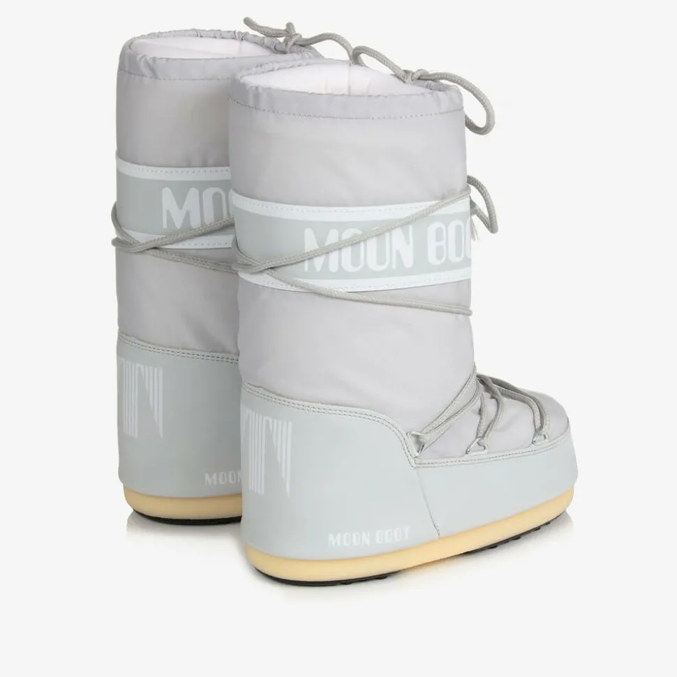 Pale grey snow boots for boys and girls, by Italian brand Moon Boot, with a white logo printed panel for a bold and iconic look. Heavily padded and ultra resistant in the original style, they feature a two-tone thermoplastic sole with little suction pads at the bottom for improved grip. They have faux leather trims with further logo branding, a stylish lace-up look and a drawstring tie on the cuffs for a warm and comfortable fit. The technological foam lining will feel snug at first but will mould to the size and shape of the foot after a few hours of wear.