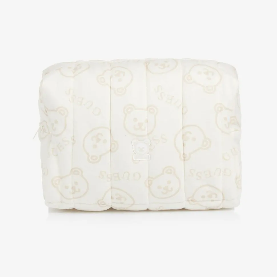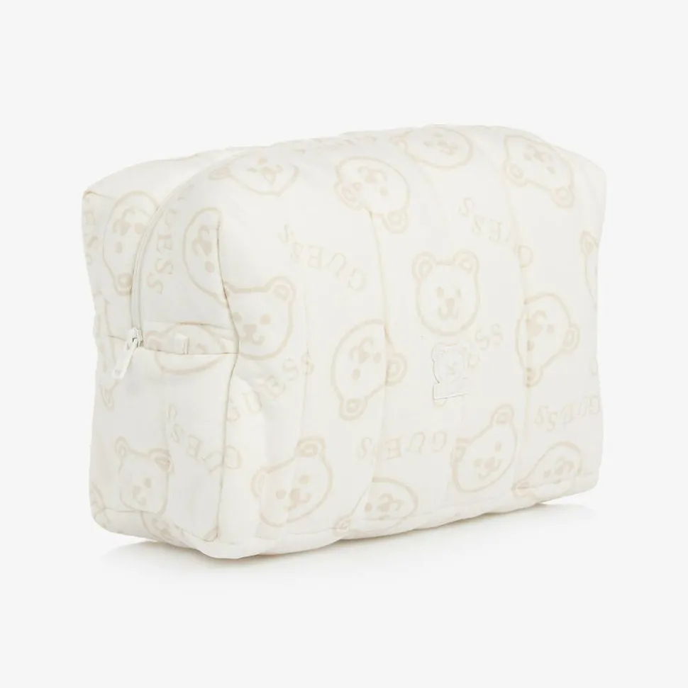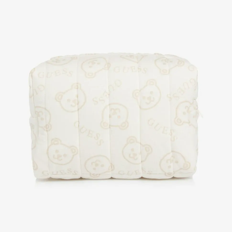 Ivory cotton jersey wash bag by Guess, with an all-over beige teddy and logo print. It is softly padded and has two internal slip pockets to help with organisation. There is an easy zip fastening, with a cute teddy logo appliqué on the front. This item contains organic cotton fibres.