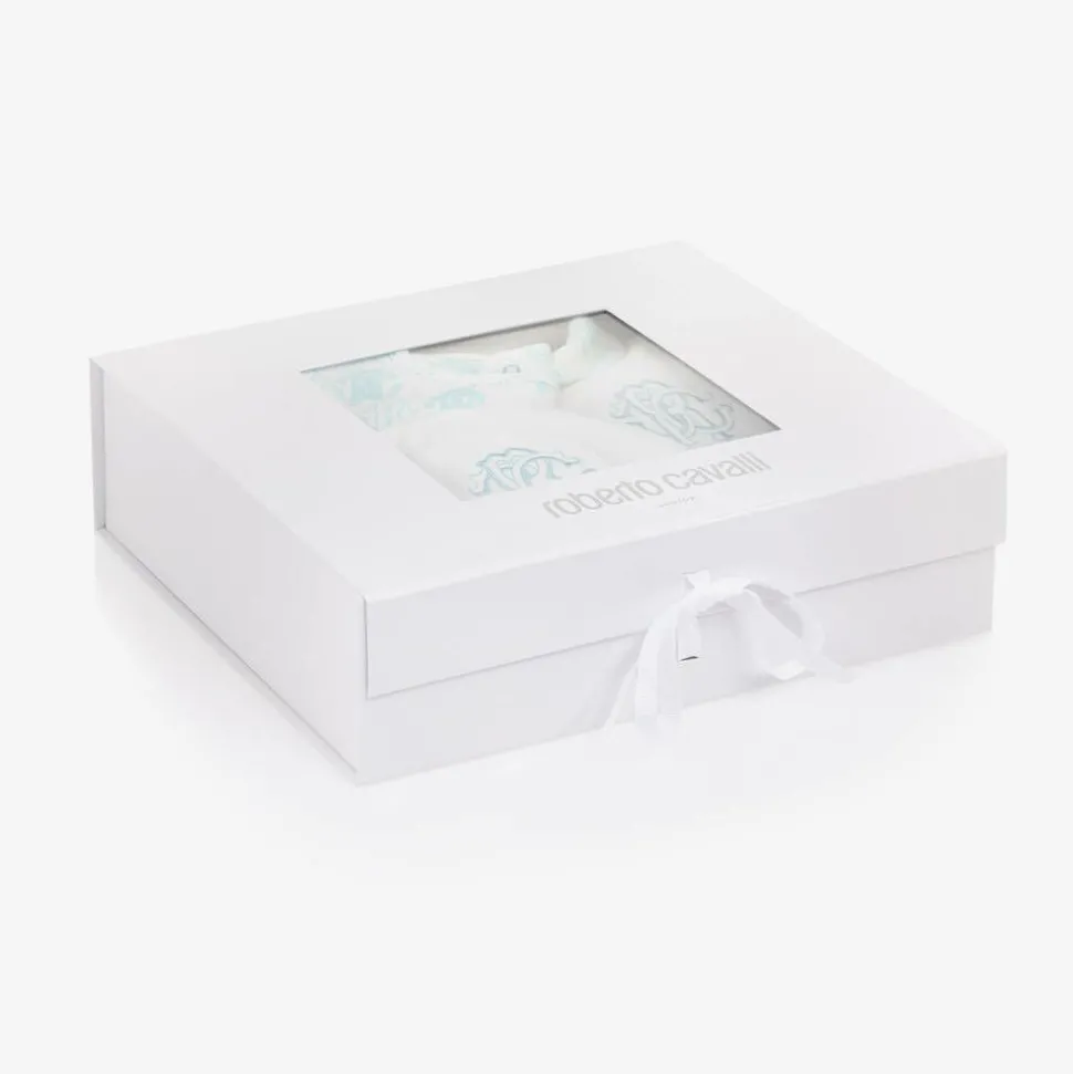 Beautifully presented in a branded box, this ivory babysuit set for boys by luxury Italian designer Roberto Cavalli, is made in the softest cotton jersey. Making a lovely gift for a new arrival, the babygrow is trimmed with the iconic RC Monogram in blue, with logo embroidery on the chest and embossed gold-tone popper fastenings on the front. To complete the sweet outfit, it comes with a matching hat with a cute turn-up brim and a useful popper-fastening bib that is ideal for catching little spills.