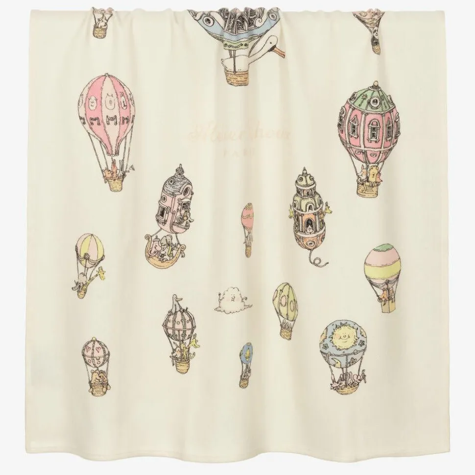 Ivory blanket for baby boys and girls by Atelier Choux Paris, knitted in a luxurious cashmere and wool blend. Super soft and lightweight, it has sweet, hot air balloons and fun cartoon clouds, with the signature brand name in the centre. Gentle on the skin, this versatile nursery accessory can be used all year round as a cosy cot cover for baby, or when out and about in the stroller. It is presented in a beautiful gift box and can be cherished as a lovely keepsake.