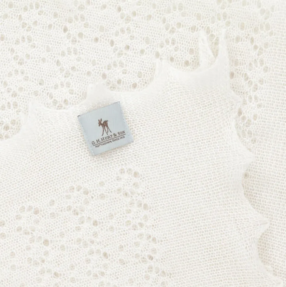 Beautiful ivory shawl for baby boys and girls by G.H.Hurt & Son is presented in a charming gift box. Handcrafted by artisans on centuries-old wooden frames, it is knitted in sumptuously soft cashmere with a gorgeous lacey design. Elegantly hand finished with scalloped edges, this traditional shawl is cosy, comfortable, and will make a wonderful heirloom.