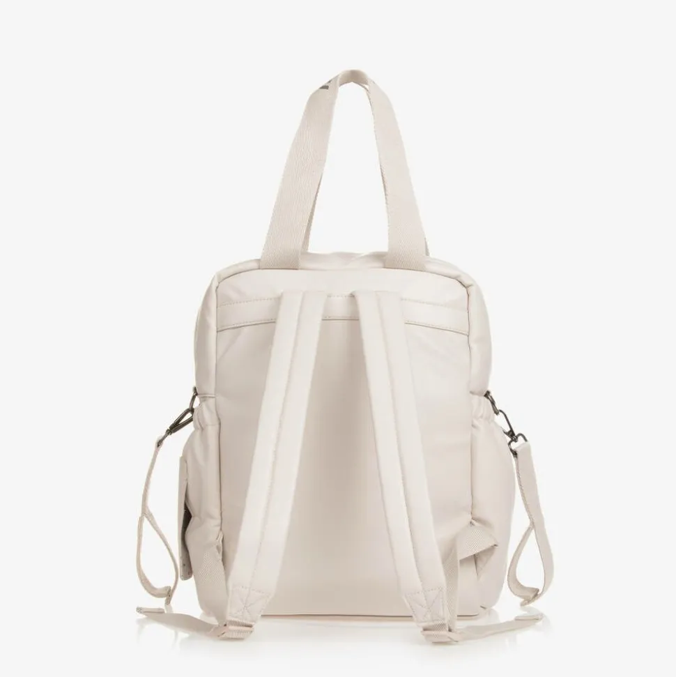 An ivory changing backpack by Mayoral, made in faux leather and lined in silky logo-patterned twill. Cleverly designed to store baby's essentials, it has a velcro-closing side pocket suitable for wipes or tissues, an inner foil-lined, insulated bottle holder, and multiple pockets. This practical bag has a two-way zip fastening and a front pocket with a drawcord detail. The bag includes a silky, padded changing mat. The branded carry handles and clip-on buggy straps are made in durable canvas, while the adjustable shoulder straps are padded for comfort.