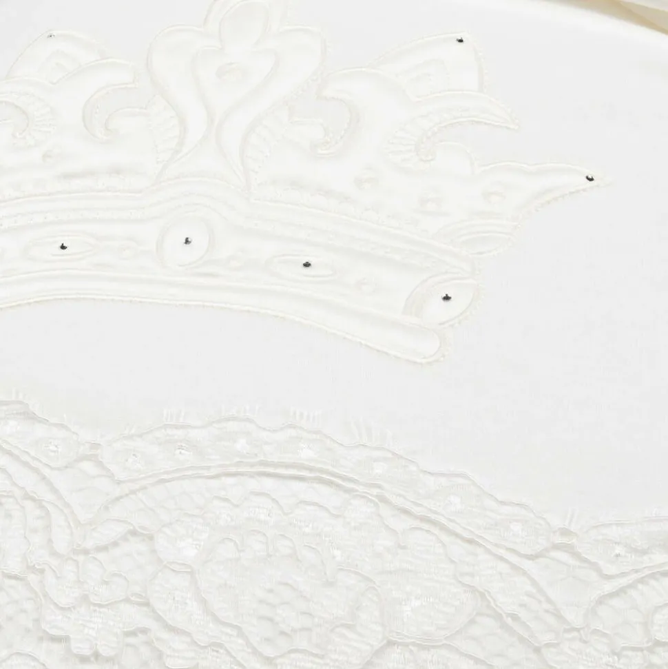Baby boys and girls soft ivory nest by Sofija, made from stretchy cotton jersey. This lightly padded nest has an embroidered crown motif with lace, satin and diamanté trim. There is a tie bow and popper fastenings, with a removable coir mat that allows for a firmer base if required.