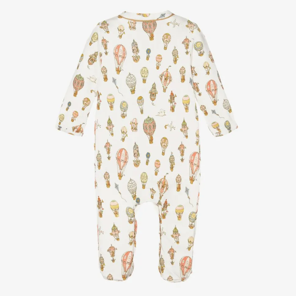 An adorable, ivory three piece babysuit set for boys and girls by Atelier Choux Paris. Made in soft organic cotton, the swaddle blanket is illustrated beautifully with French-inspired hot air balloons. Luxurious and versatile, it can be used for swaddling or protecting your shoulder when holding a small baby. The matching, soft cotton babygrow has a smart, gold thread trim with gold branded popper fastenings for easy changing. The absorbent, double-sided bib has an adjustable popper fastening for an ideal fit. All three pieces come in a beautiful, complementary gift box.