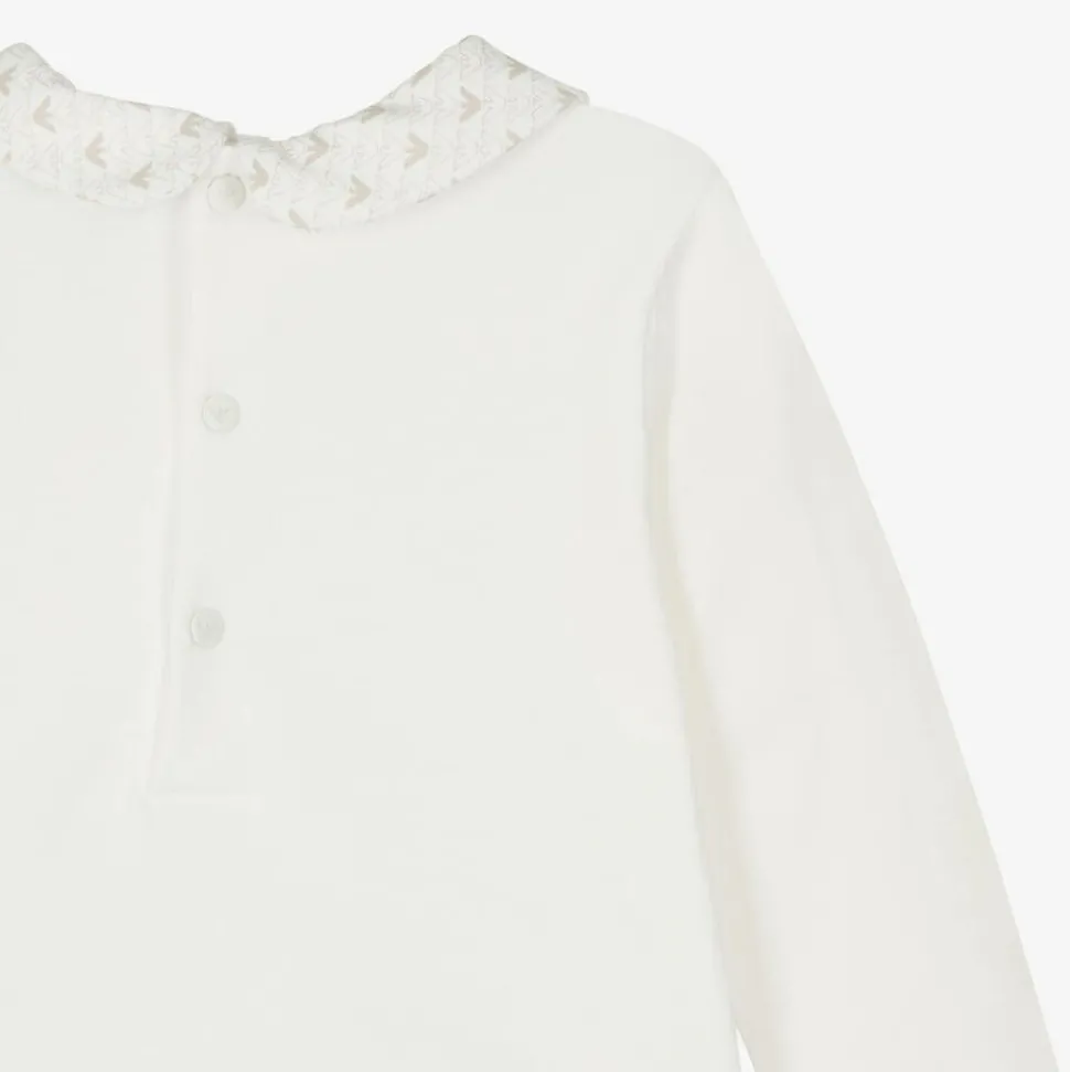 A lovely ivory babysuit set for boys and girls by Emporio Armani, made from soft cotton jersey. The dungaree-style babygrow is printed with a beige Eagle logo pattern and fastens with covered buttons on the shoulders. The bodysuit has a sweet Peter Pan collar that matches with the babygrow for a coordinating look. Both pieces have popper fastenings between the legs to make dressing easier.