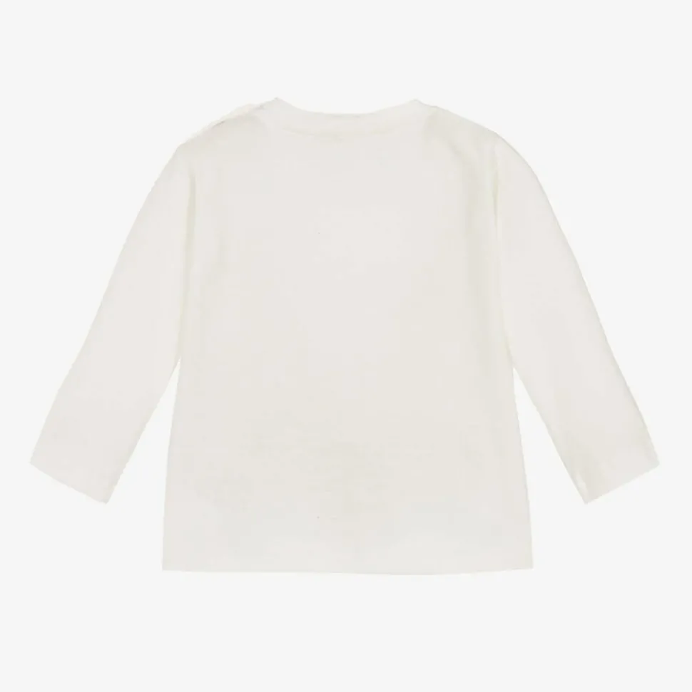 A festive ivory long-sleeved top for little boys and girls by Everything Must Change. Made from soft cotton jersey, it is printed with a cute reindeer wearing a tartan scarf design on the chest. To help with dressing, it has popper fastenings on one shoulder.