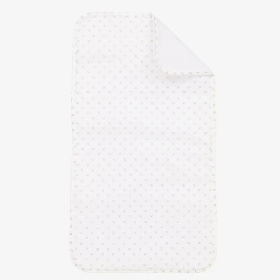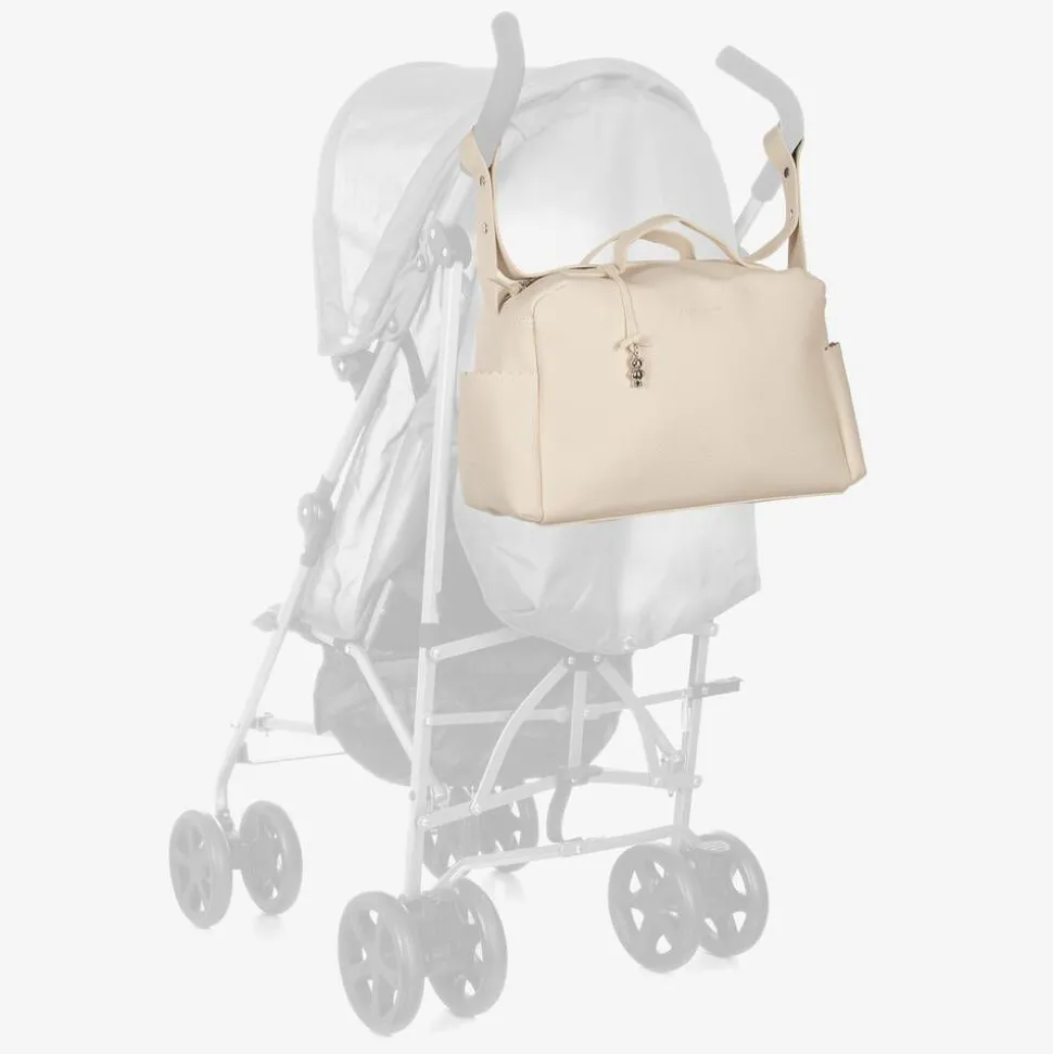 Stylish ivory changing bag by Pasito a Pasito, made in grained faux leather with an embossed logo on one side. This practical style is fully washable, with a branded satin lining, useful internal and external pockets for organising belongings, and a secure zip fastening. There are useful carry handles and the shoulder strap can be converted to stroller straps using poppers. It comes with a lightly padded changing mat with a soft towelling surface and a cute silver metal teddy charm completes the look.