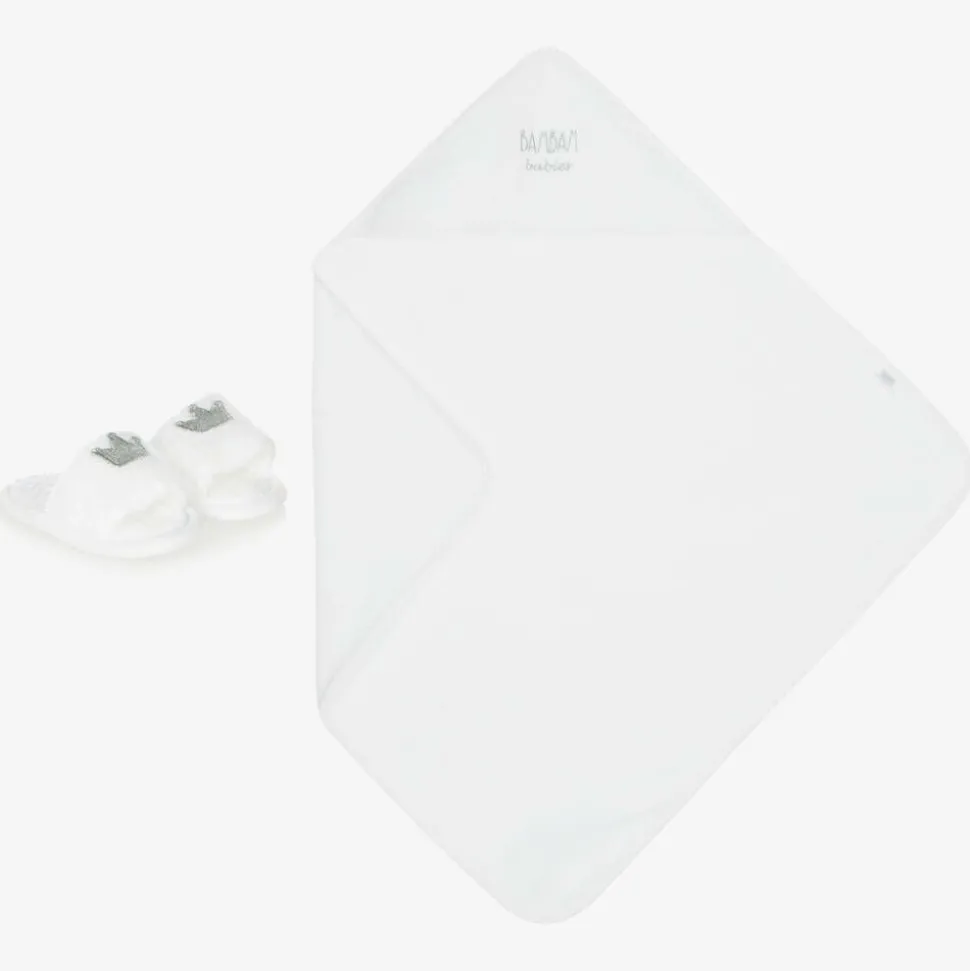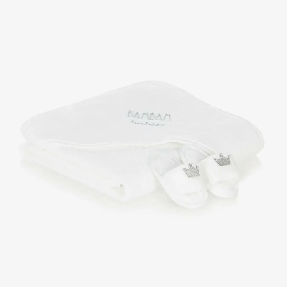 Pale ivory hooded towel and slippers set for baby boys and girls by Bam Bam. The towel is made in beautifully soft and absorbent terry cotton, with silver logo embroidery on the hood. The cute matching slippers are in a slider style and have silver embroidered crowns on the front. Coming in a gift box, this sweet set makes an ideal present for a new arrival.