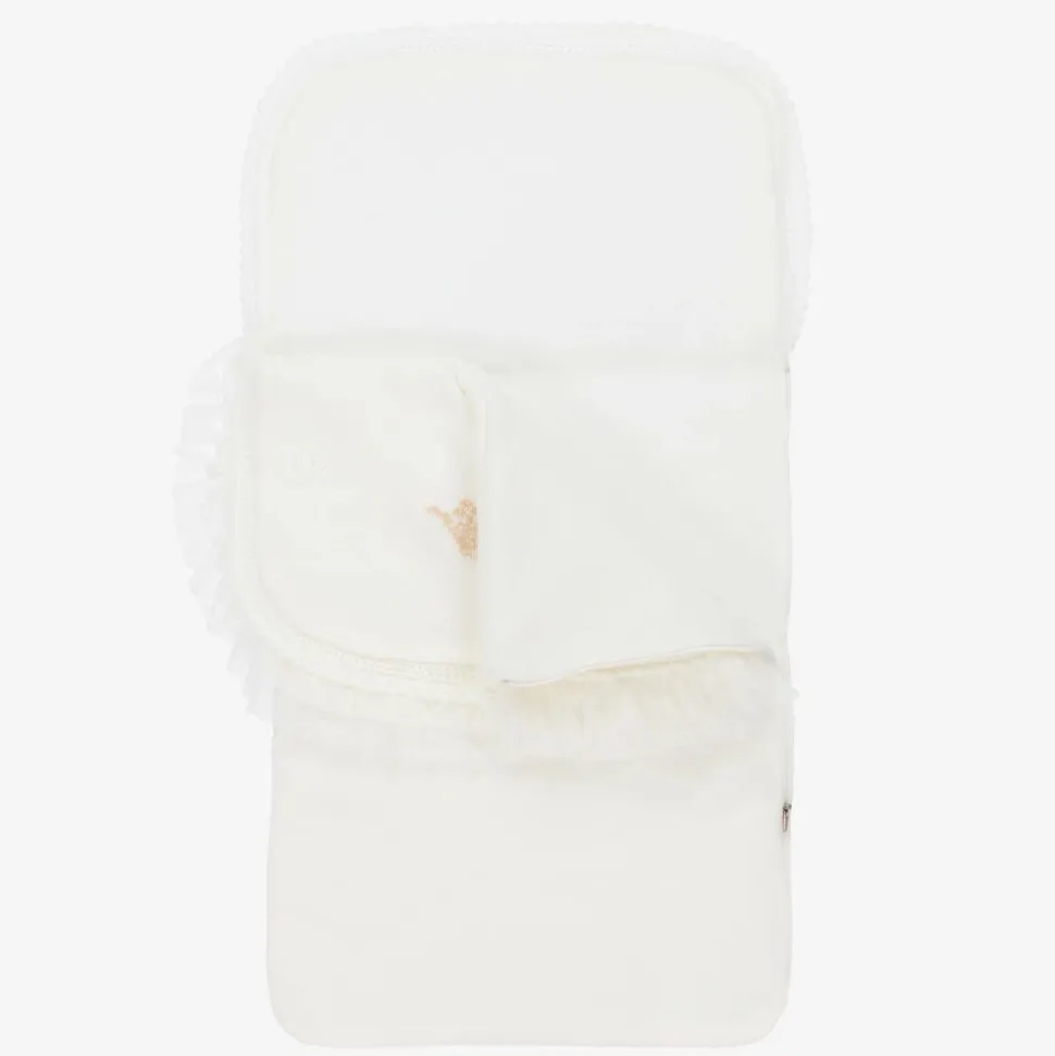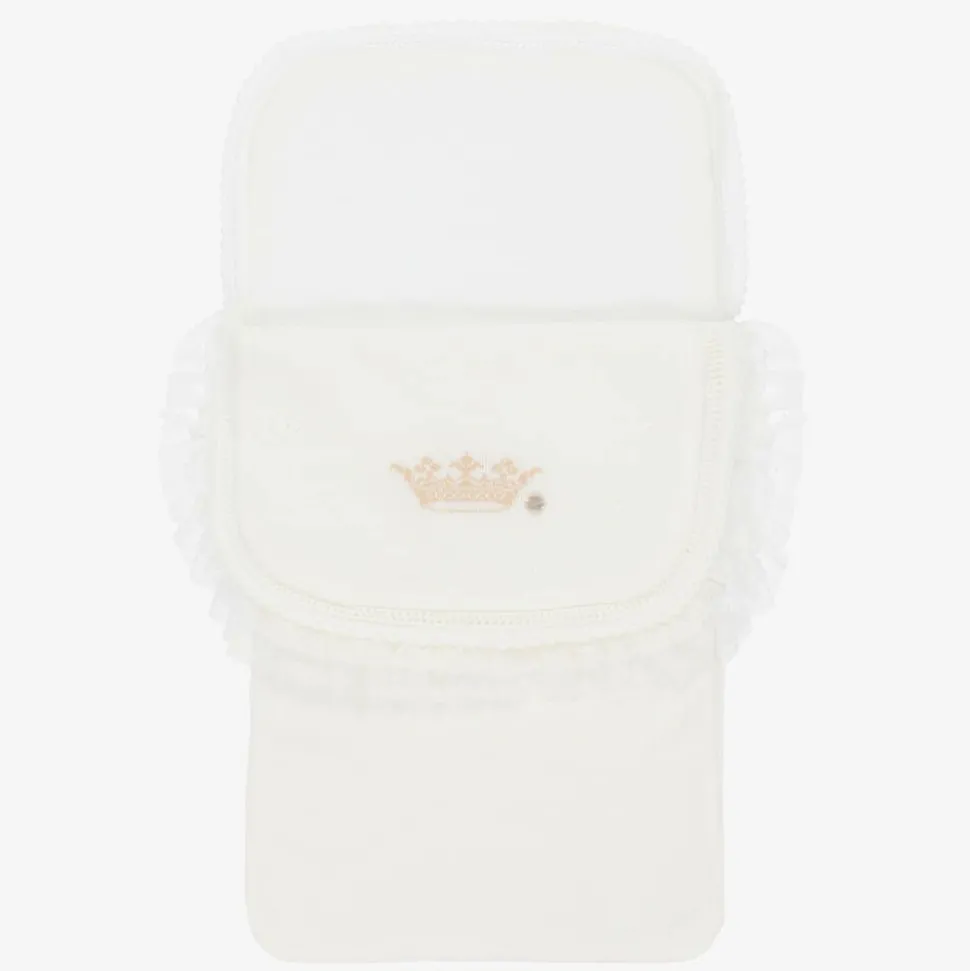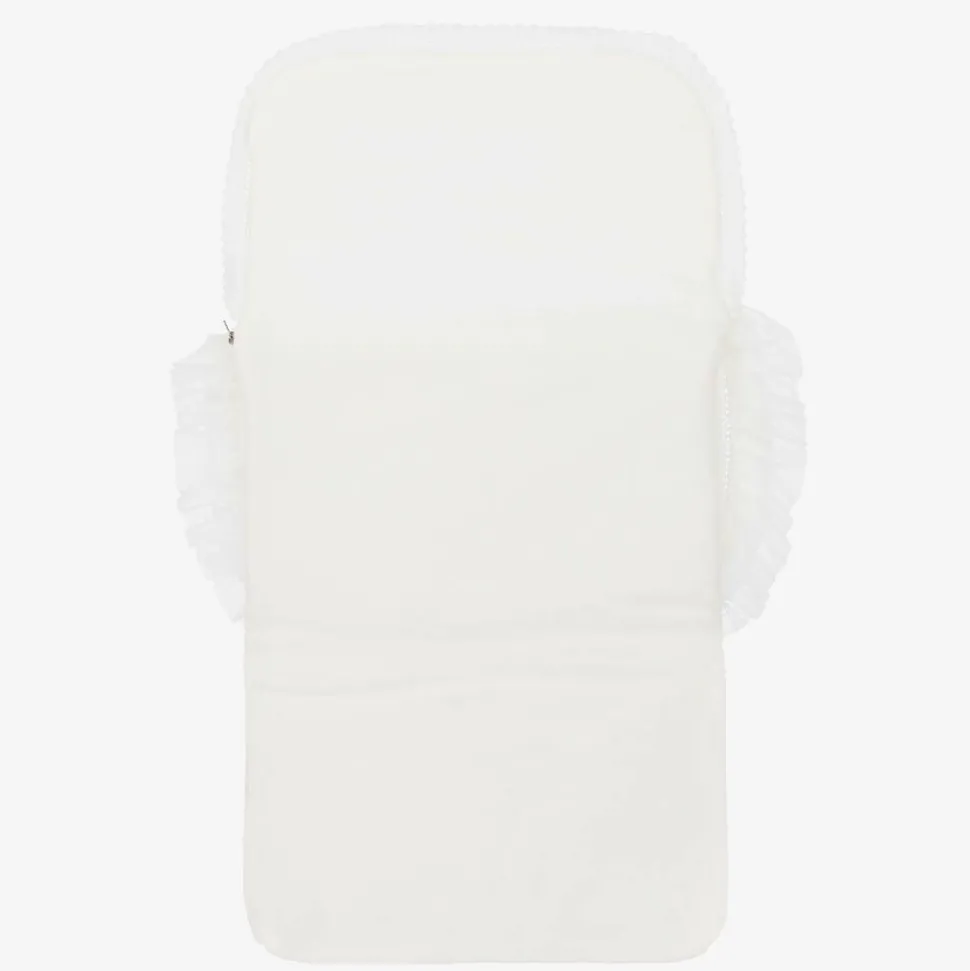 Beautifully knitted ivory nest for baby boys and girls from Artesania Granlei. Lightly padded, it has a beige crown pattern on the front with the brand's mother-of-pearl logo charm. Trimmed with pretty, knitted lace and tulle lace, it fastens with a zip on one side.